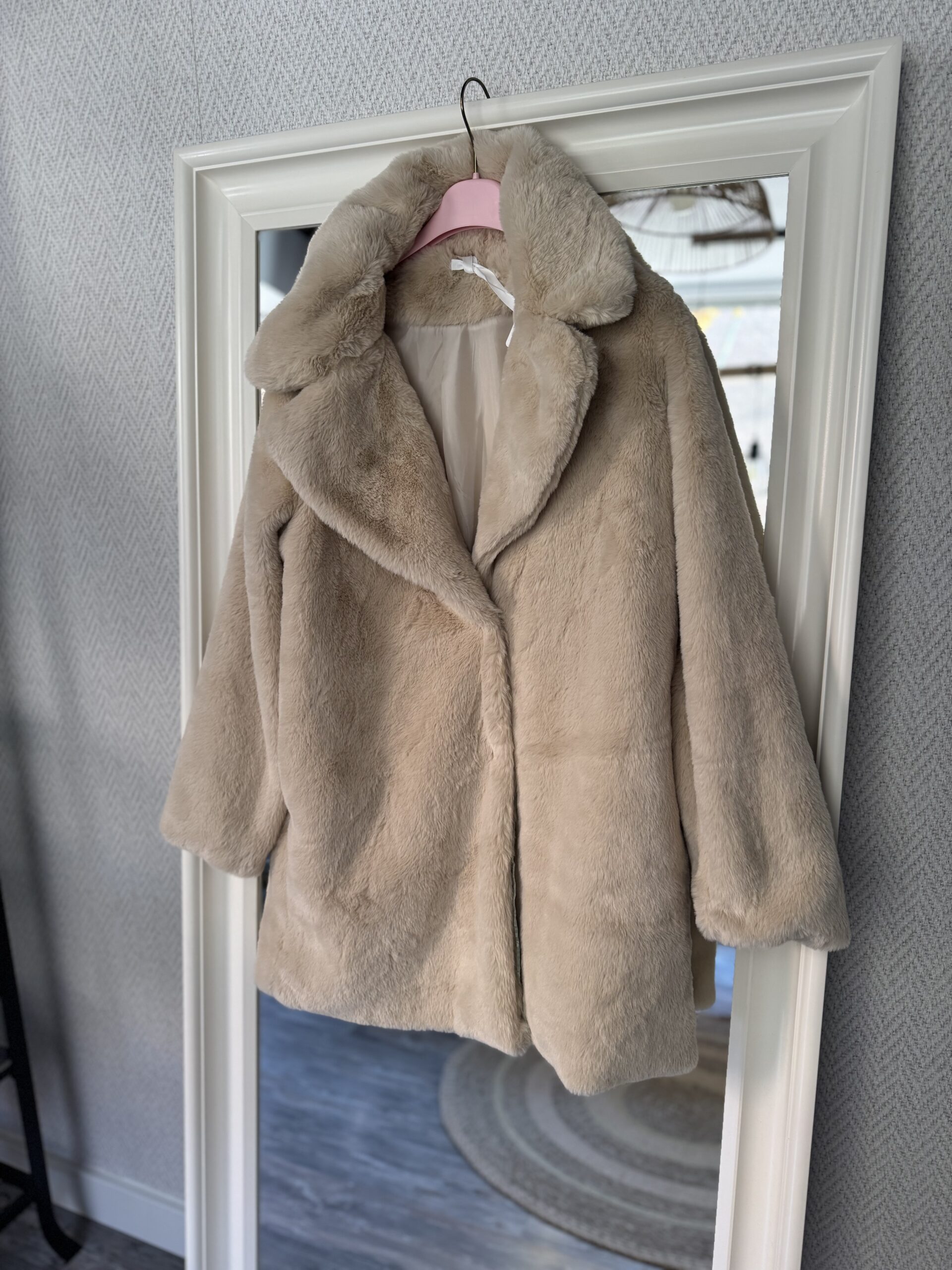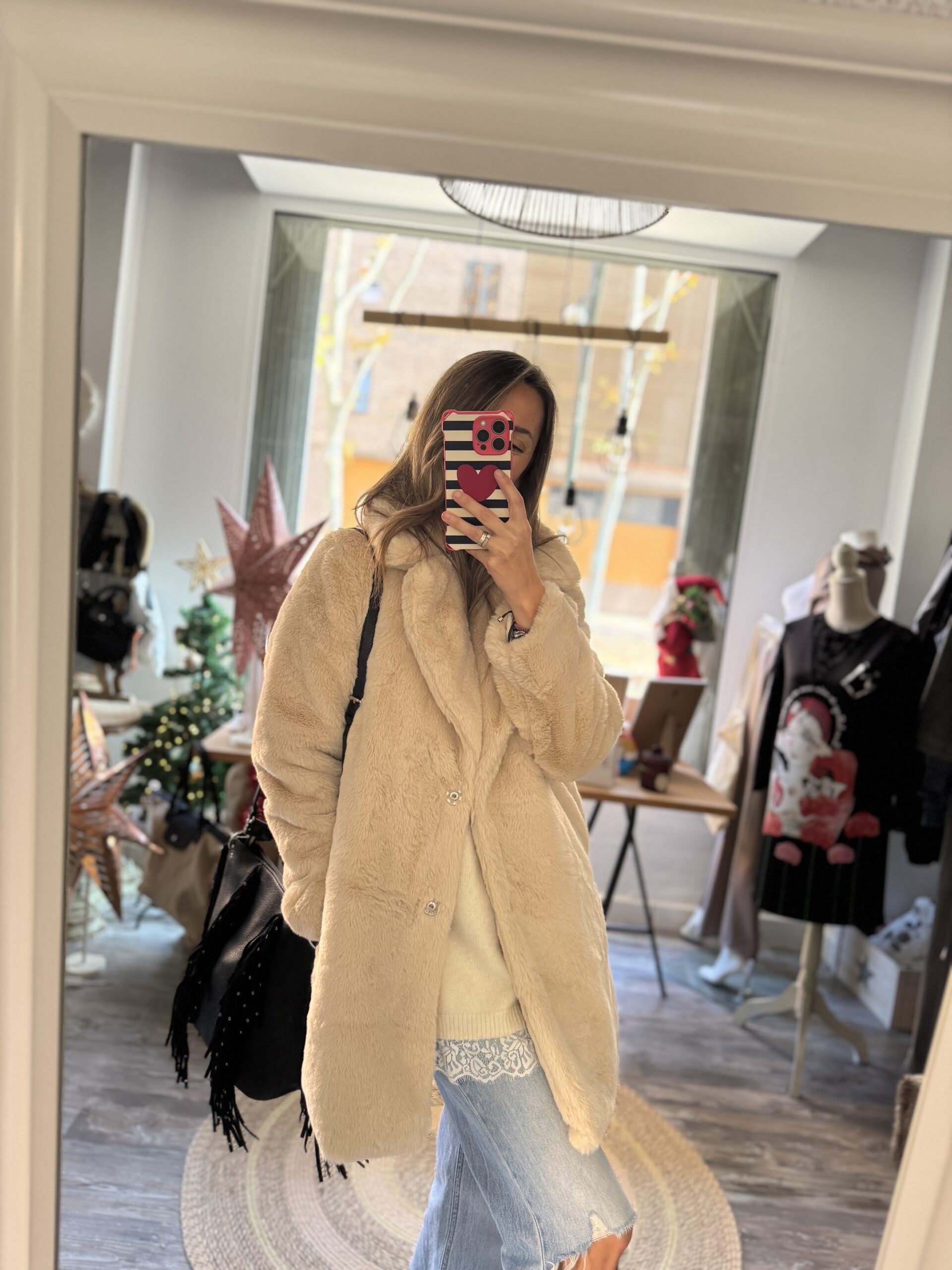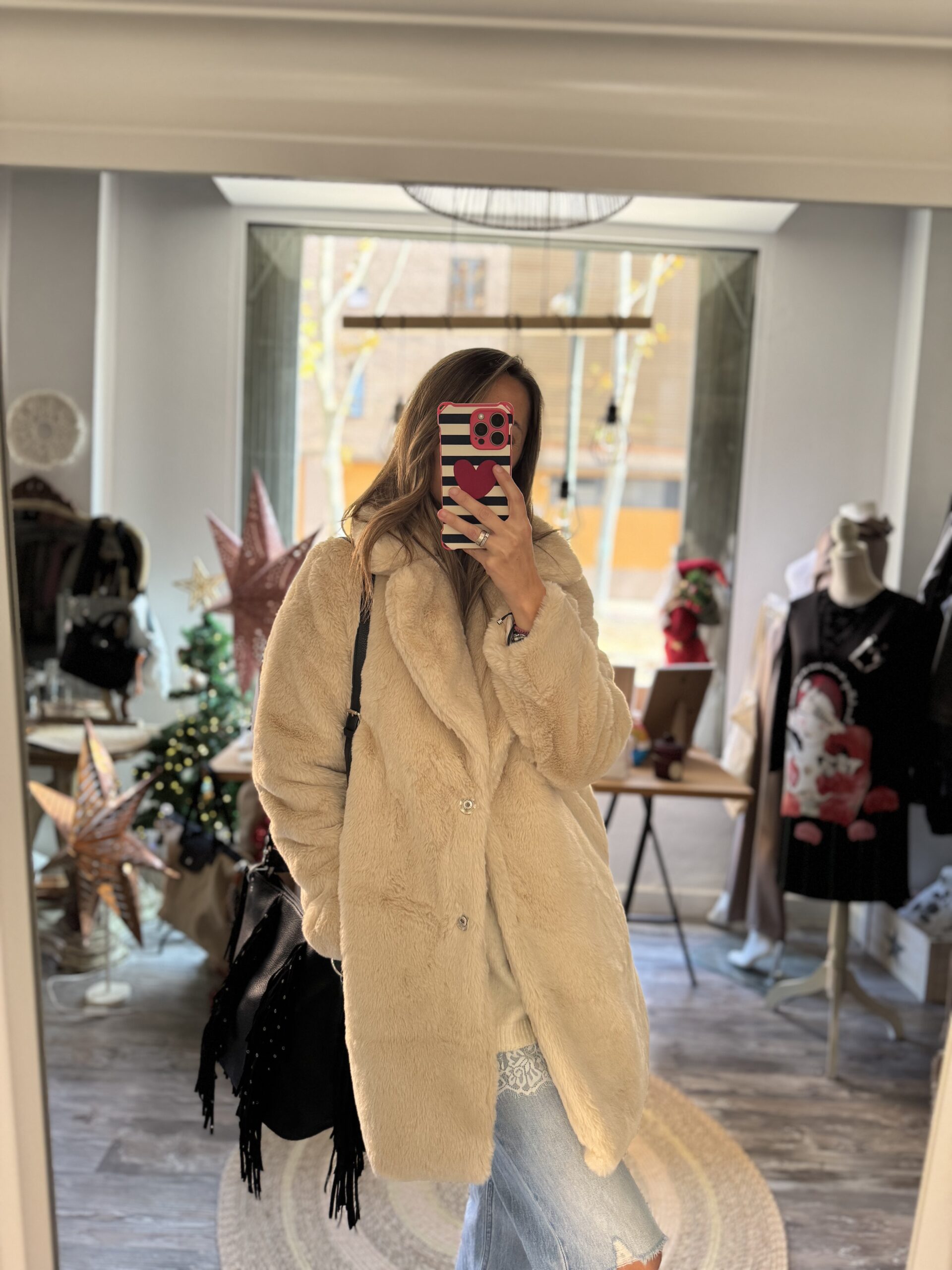 Abrigo de pelo con solapas, abrochado por botones y con bolsillos laterales.