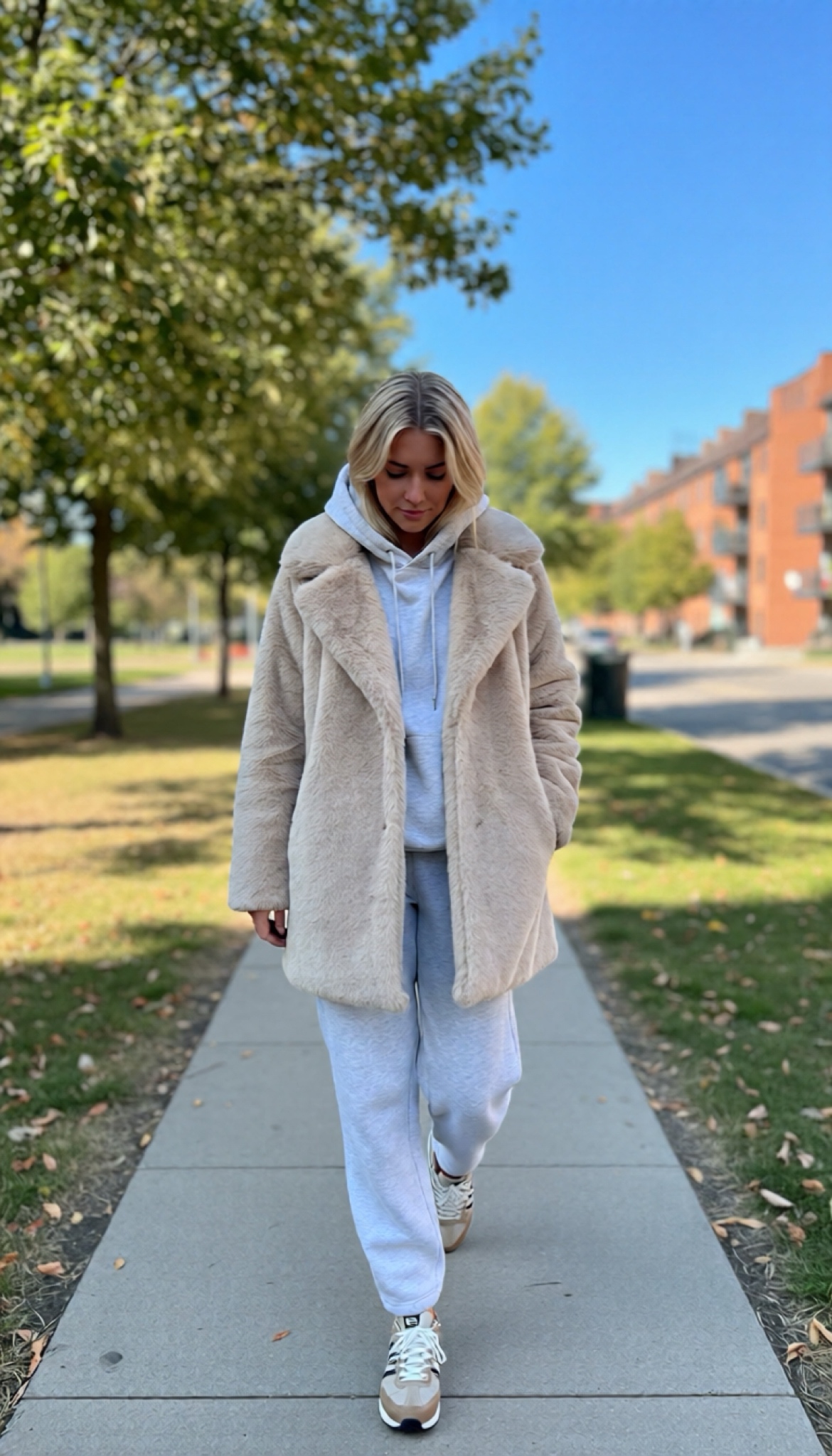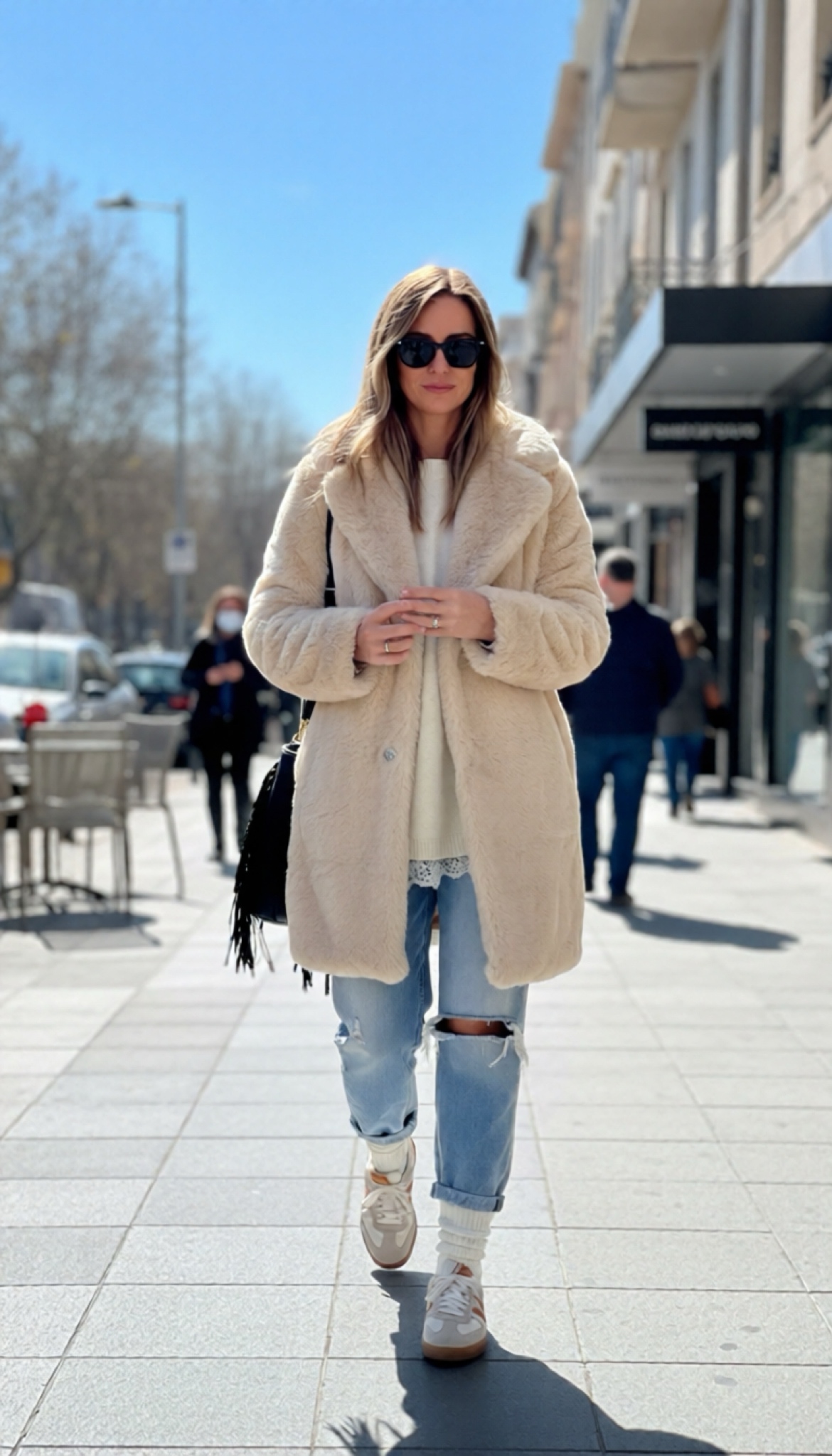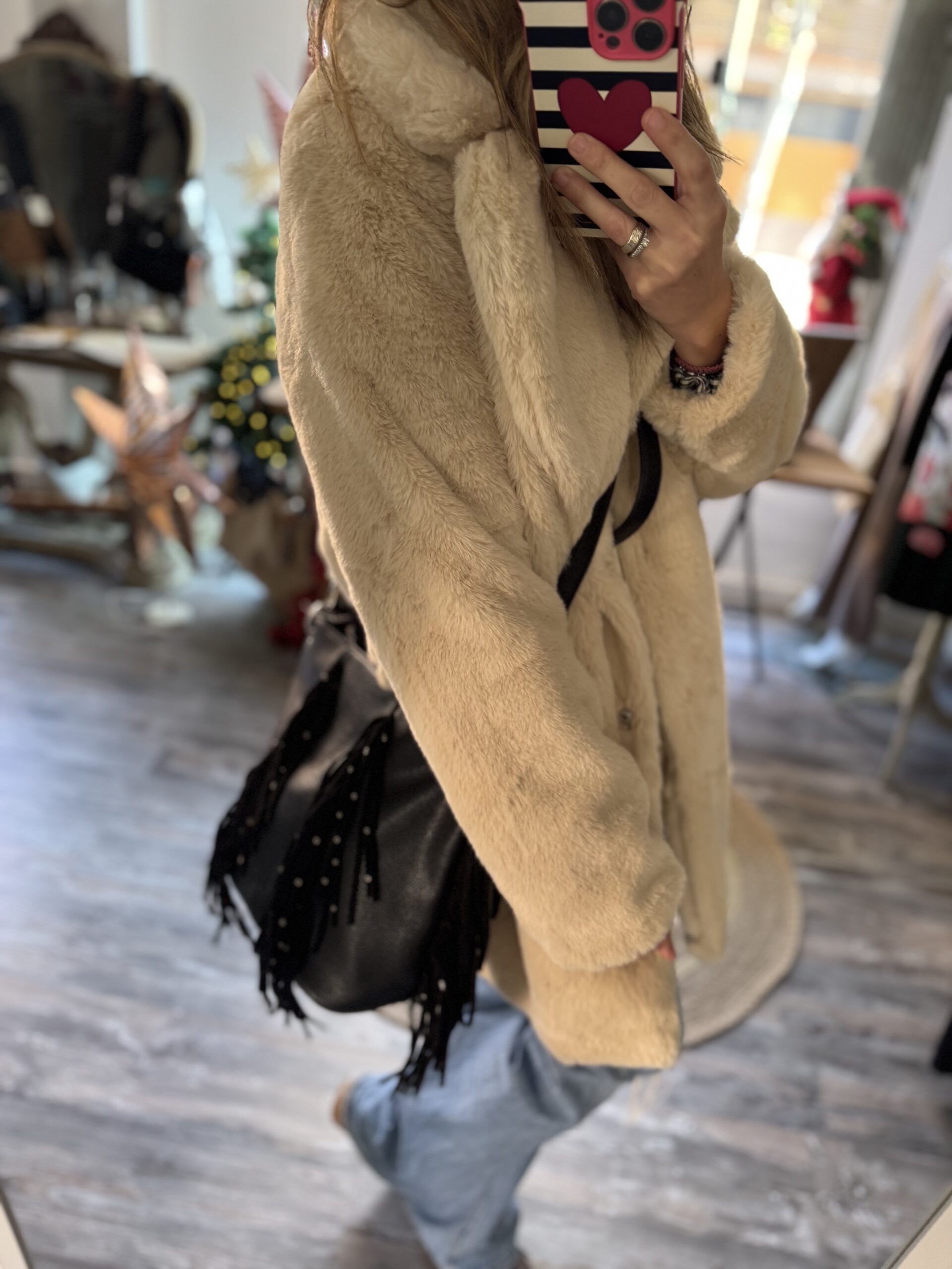 Abrigo de pelo con solapas, abrochado por botones y con bolsillos laterales.