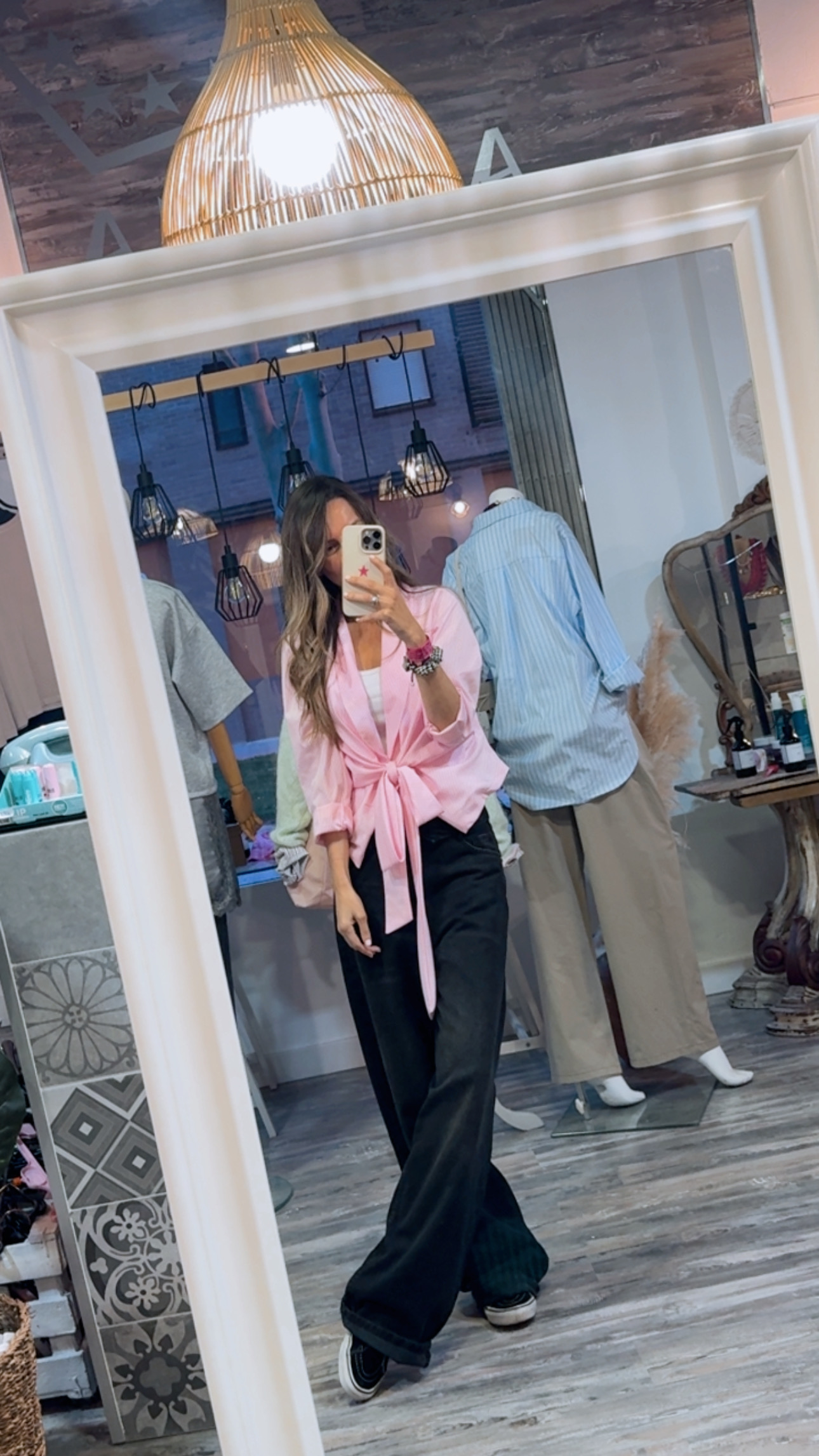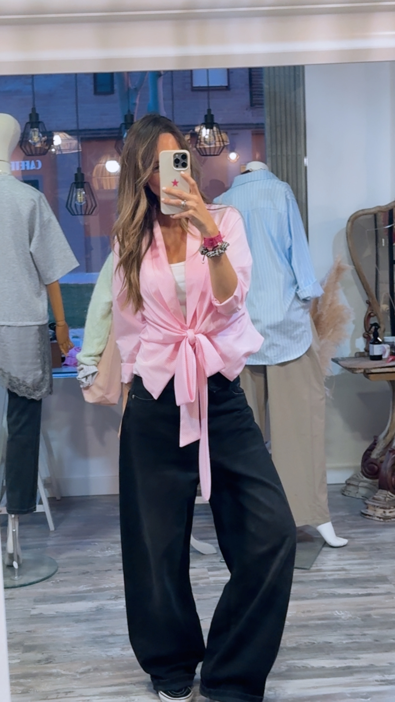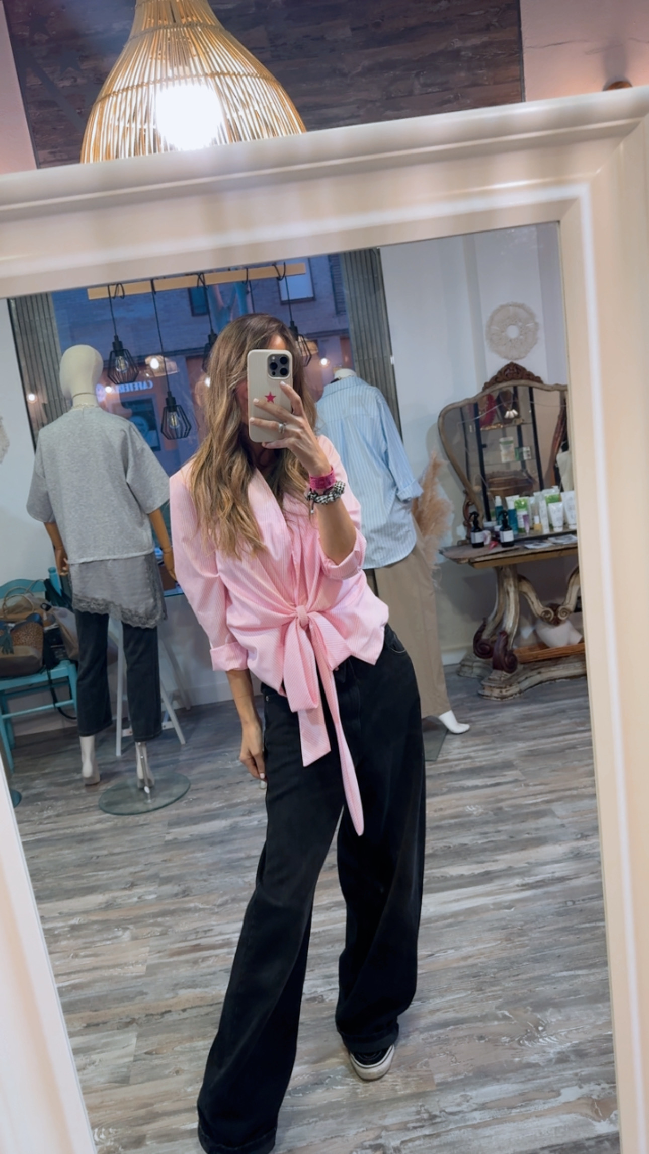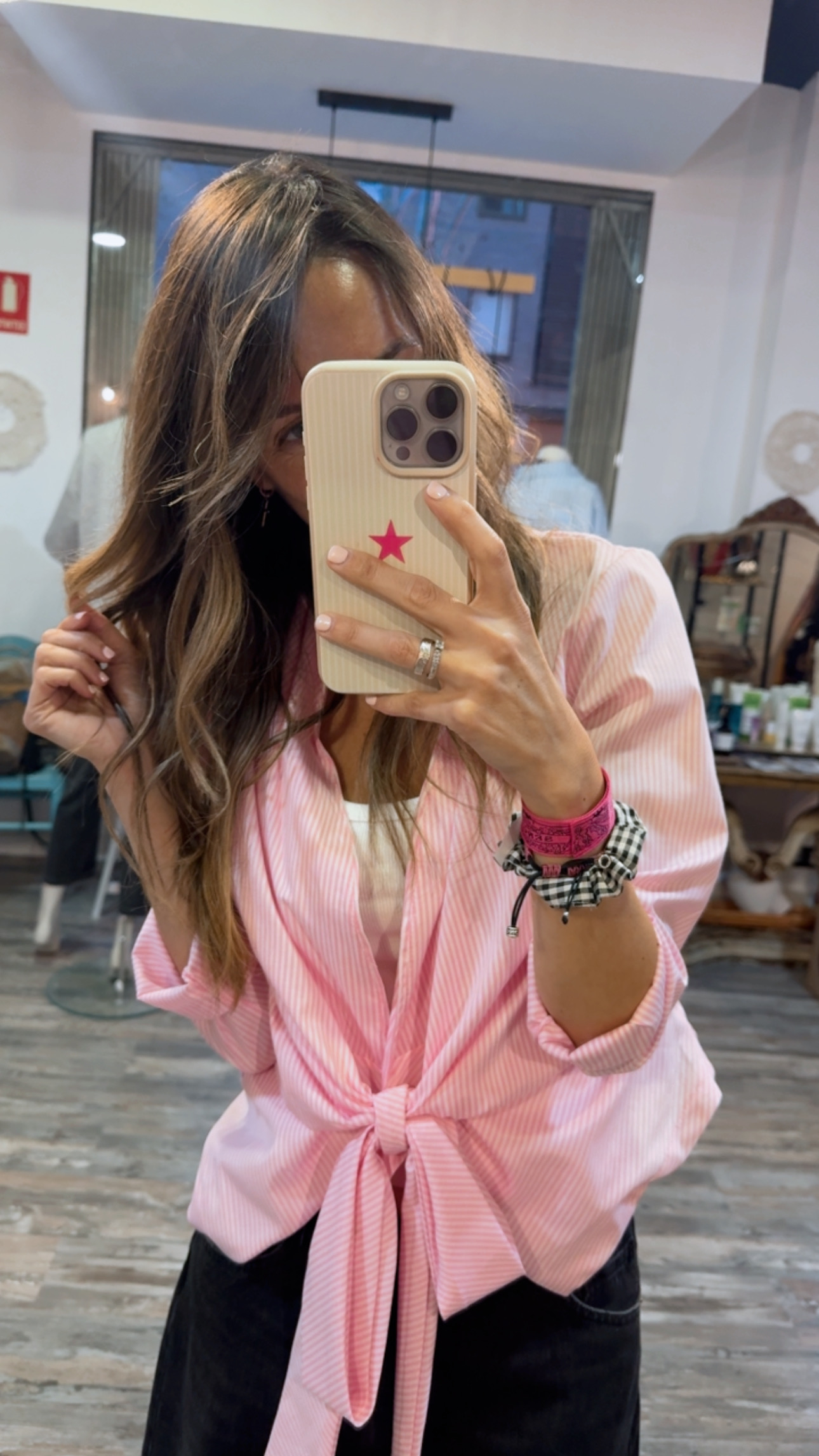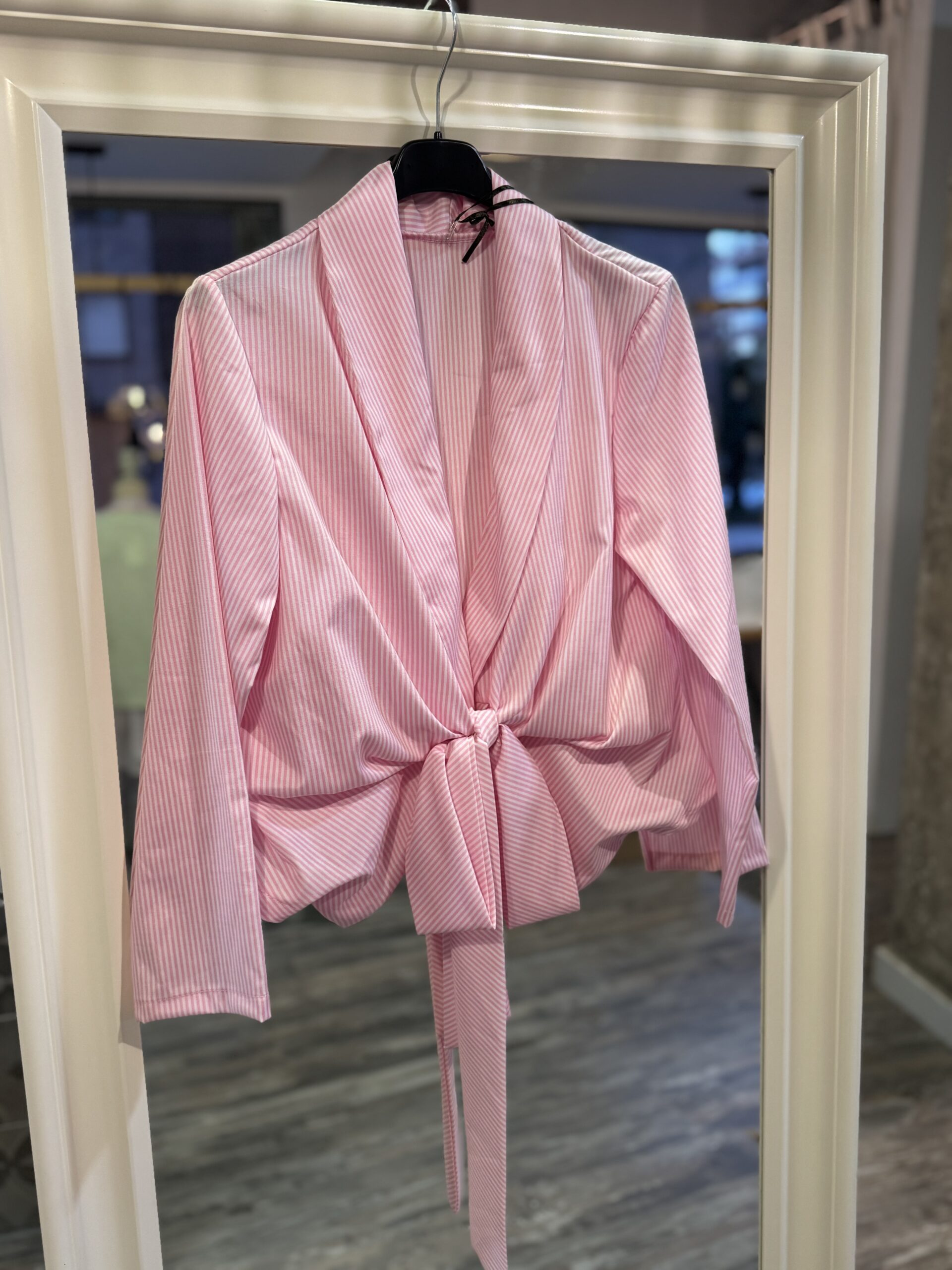 Camisa cruzada en tejido ligero de algodón con rayas finas en tono rosa claro.