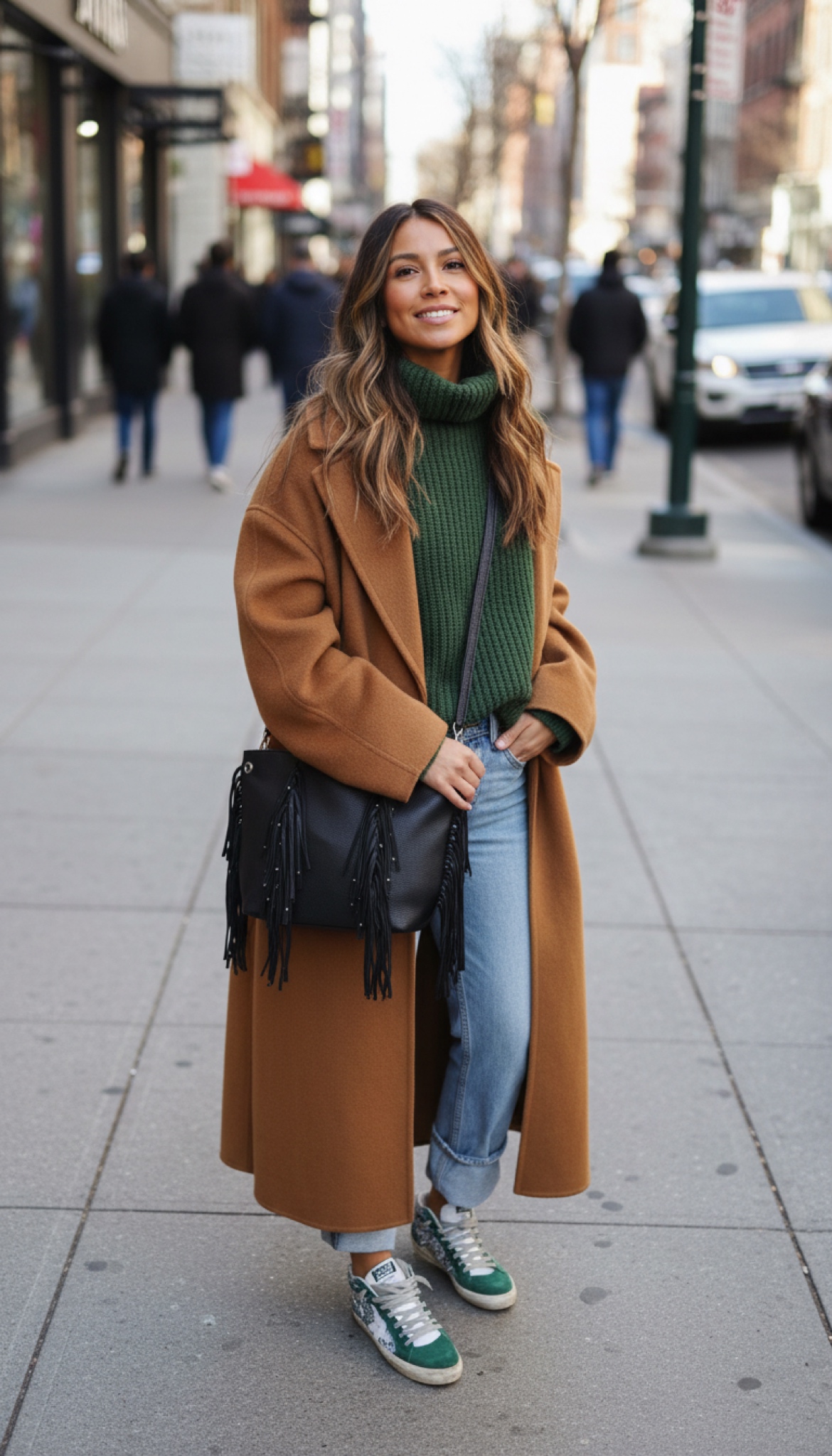 Bolso negro con detalle de tallas y flecos.