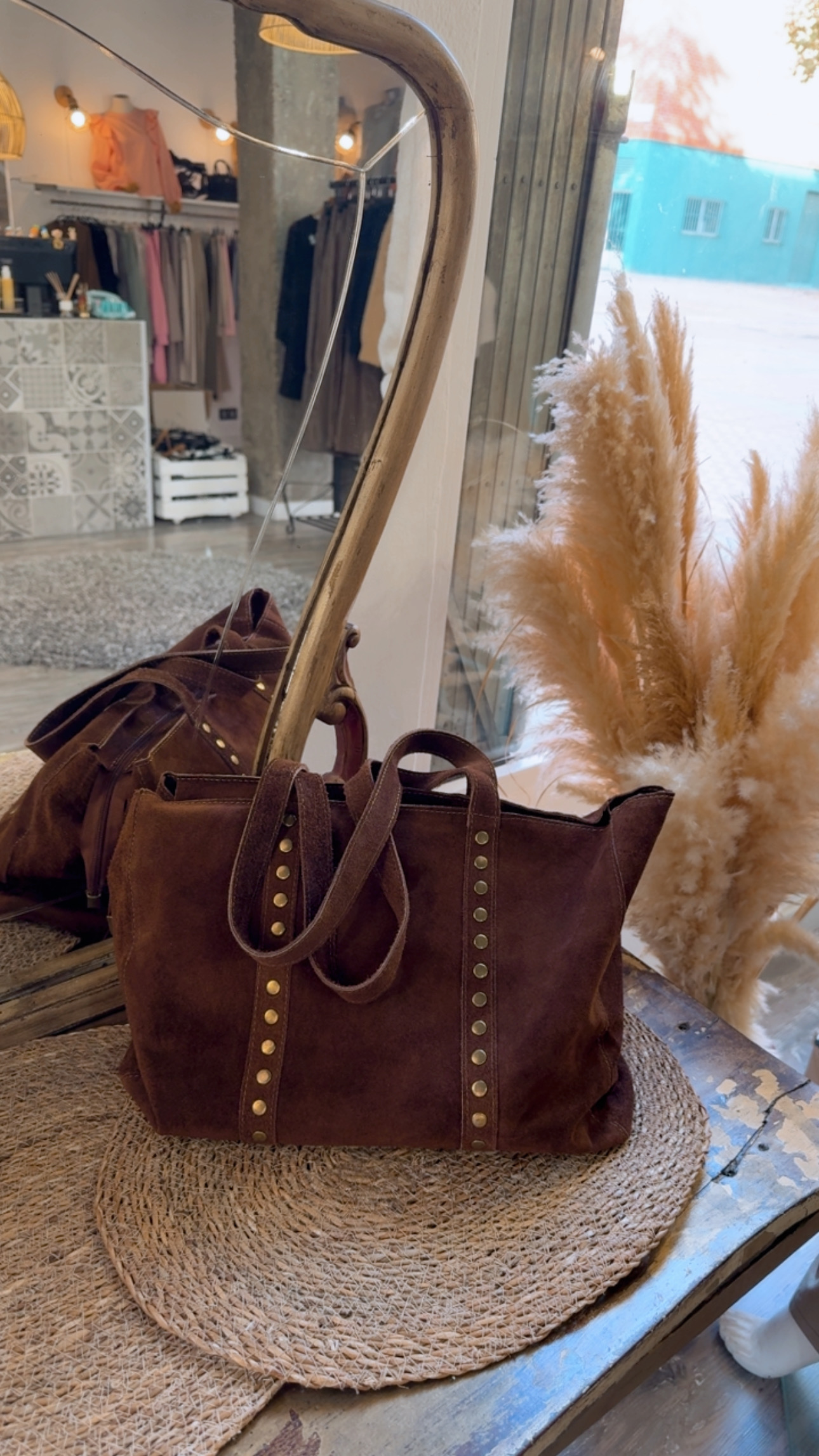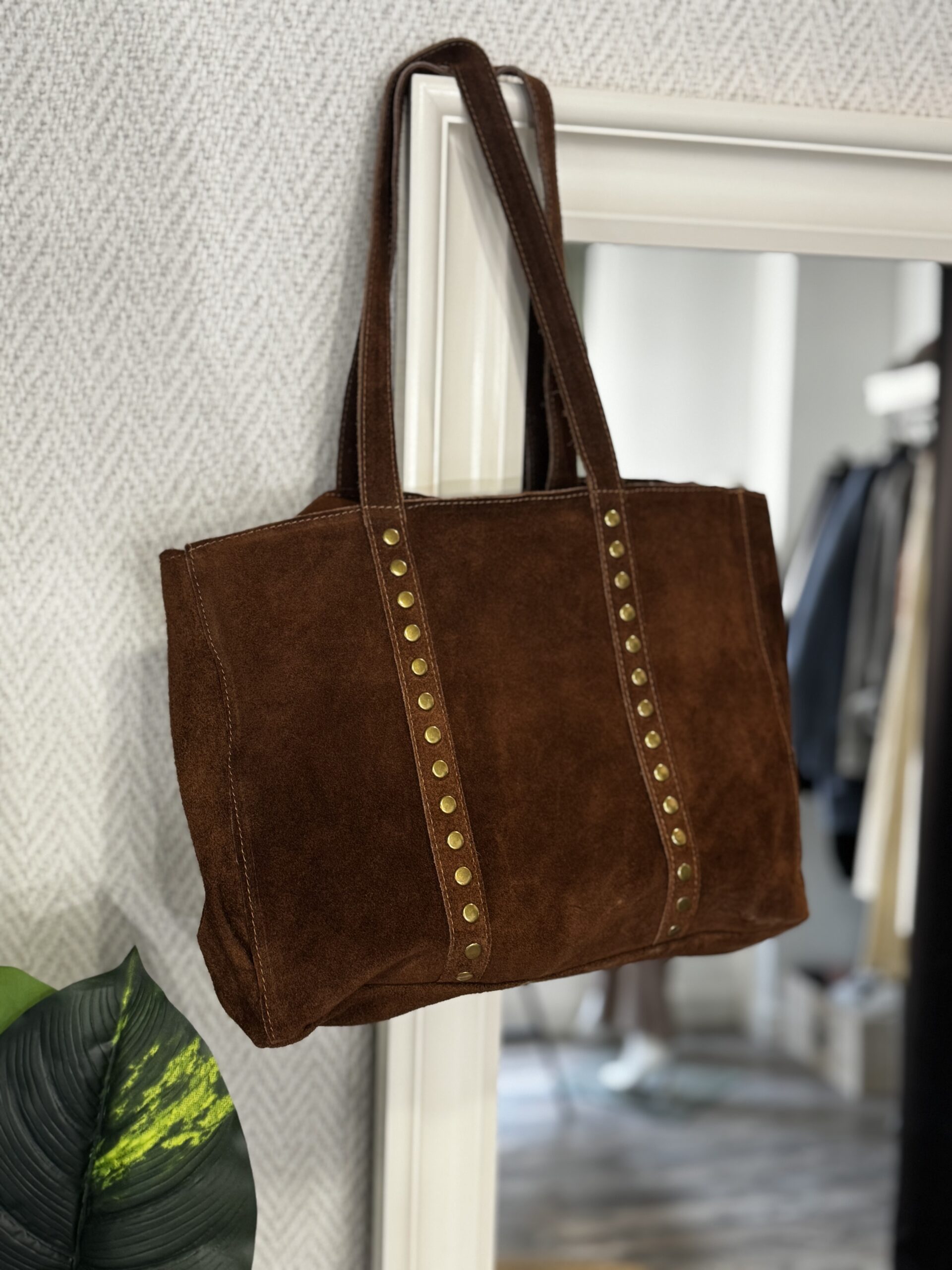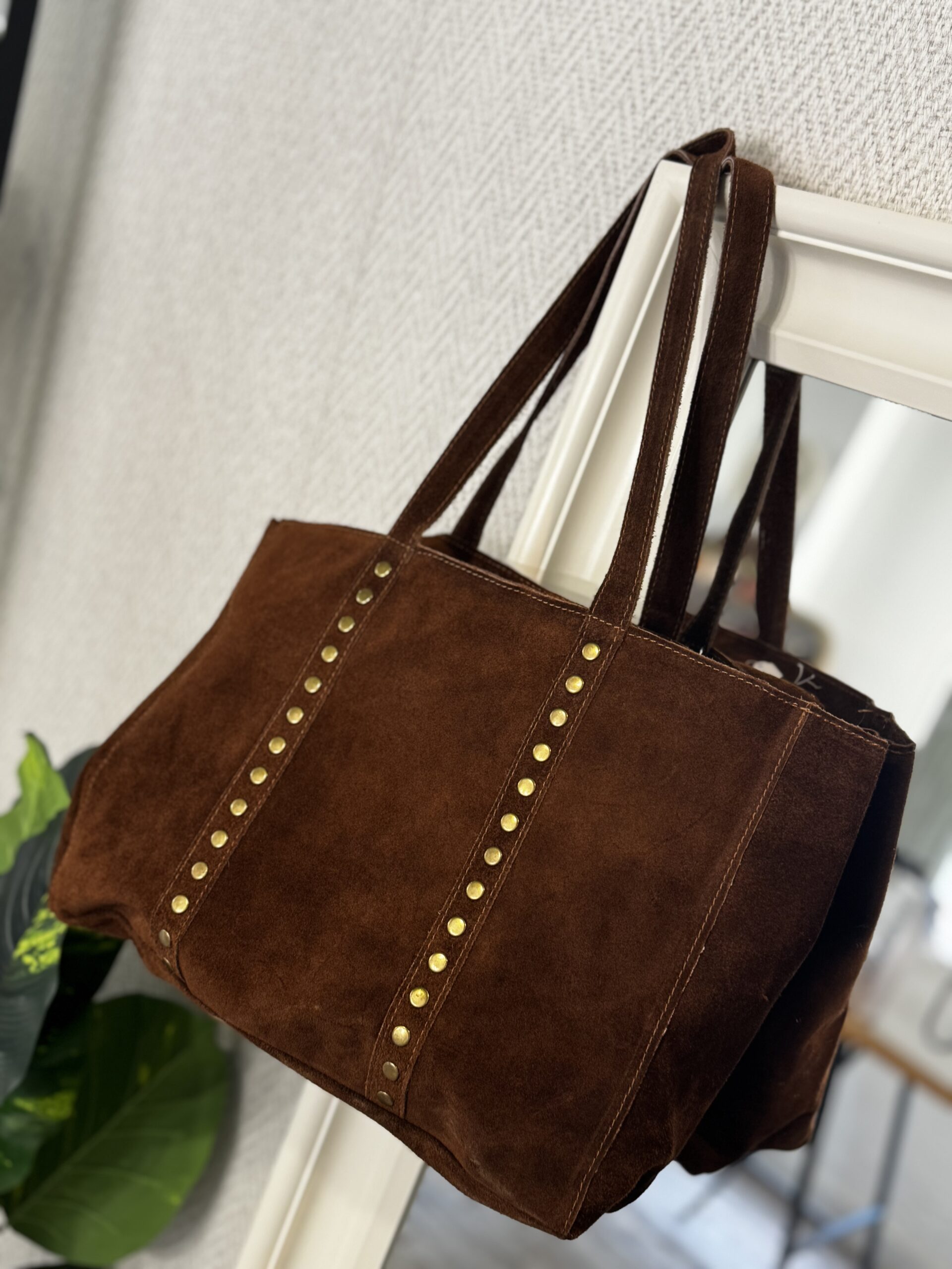Bolso de asas en piel color marrón chocolate con tachas doradas.