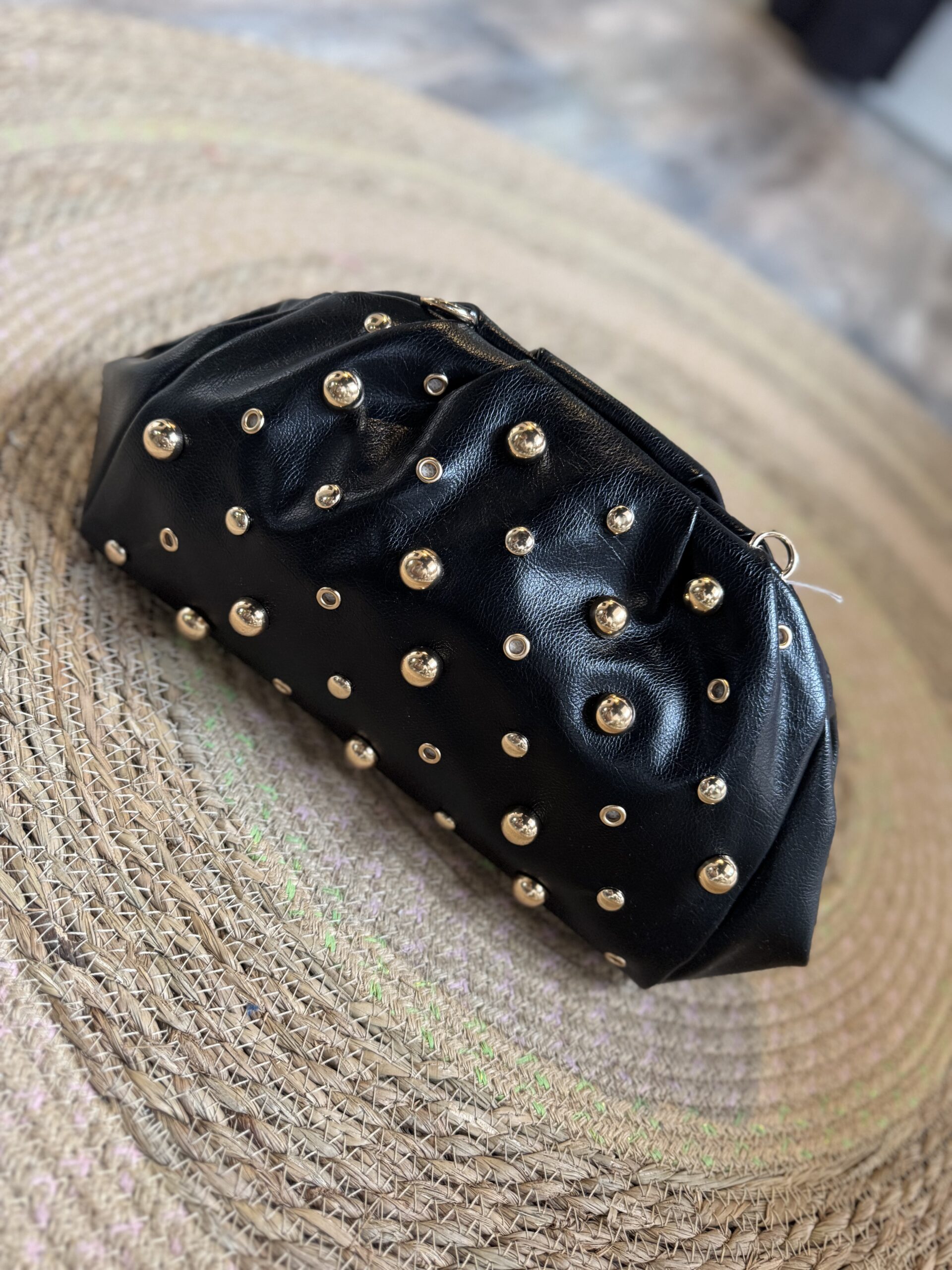 Bolso con tachas para llevar de mano o con colgador de cadena en dorado.