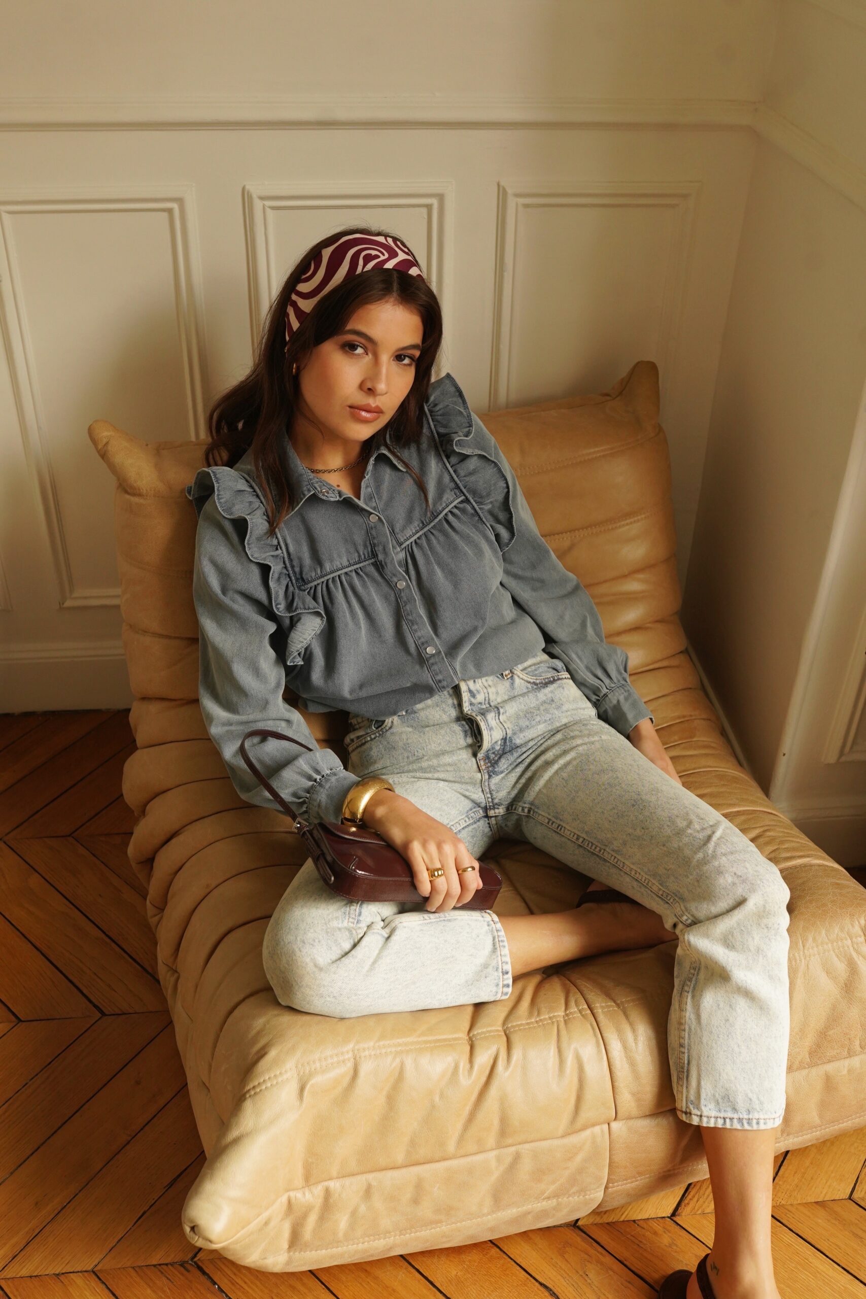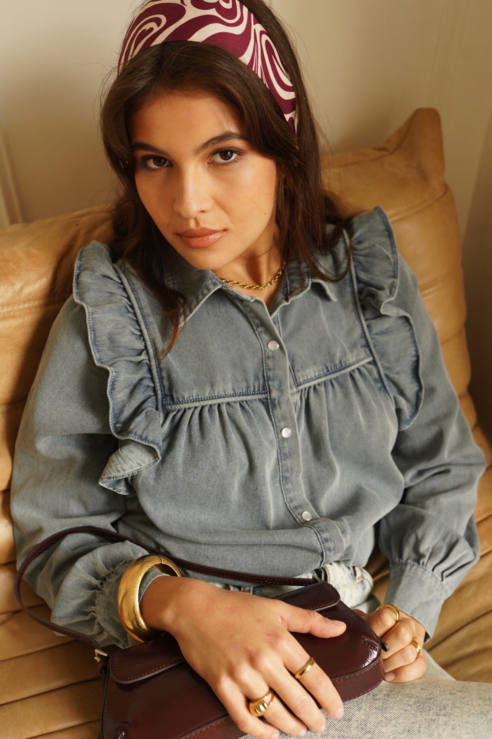 Camisa denim con detalle de volantes. Su corte recto y femenino le da un toque muy casual y chic.