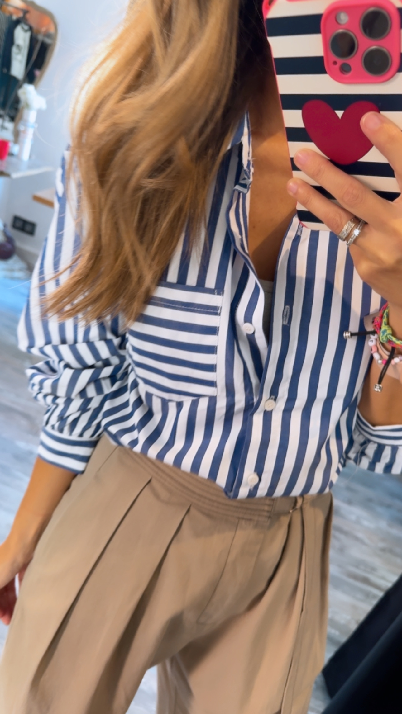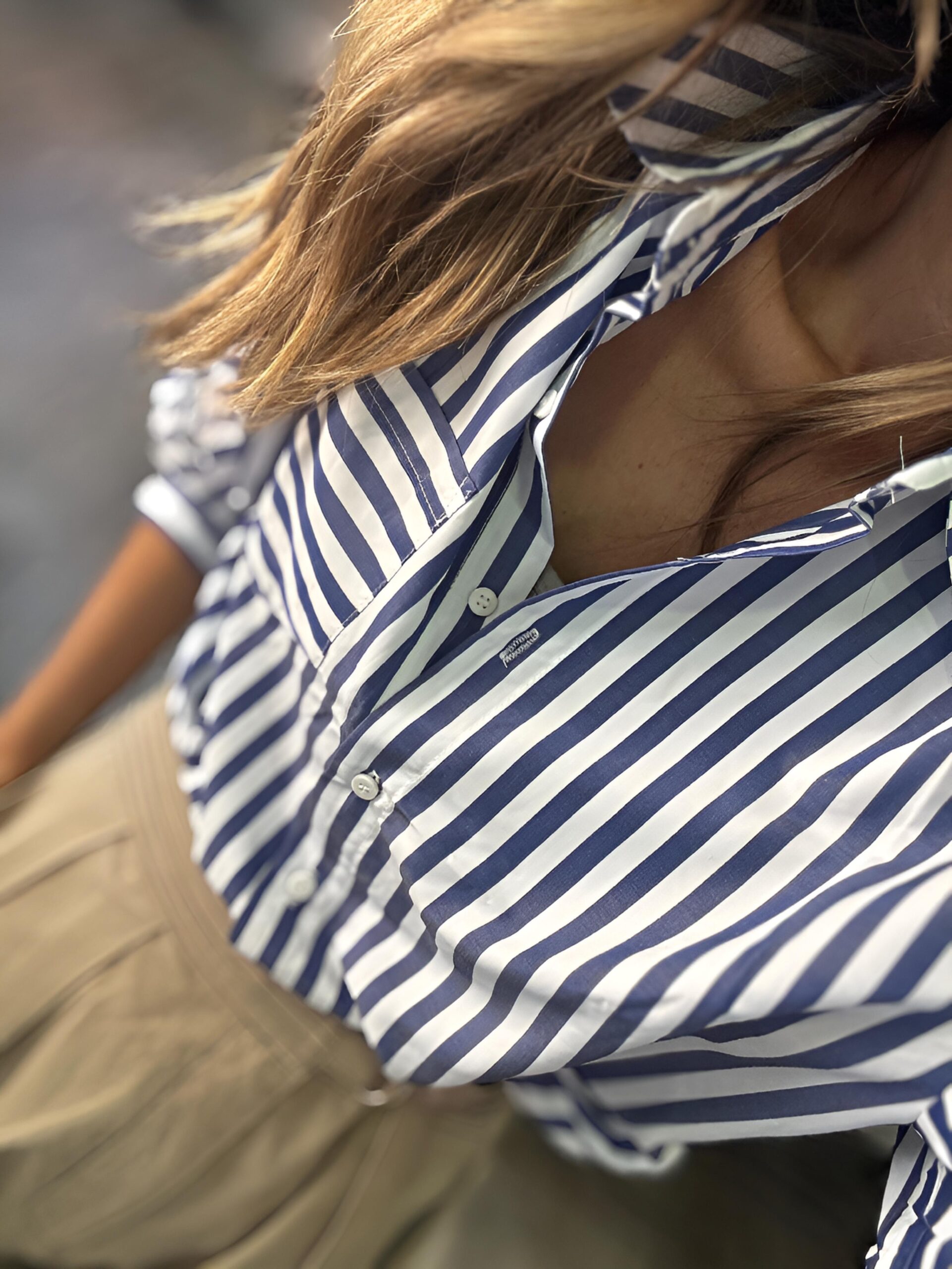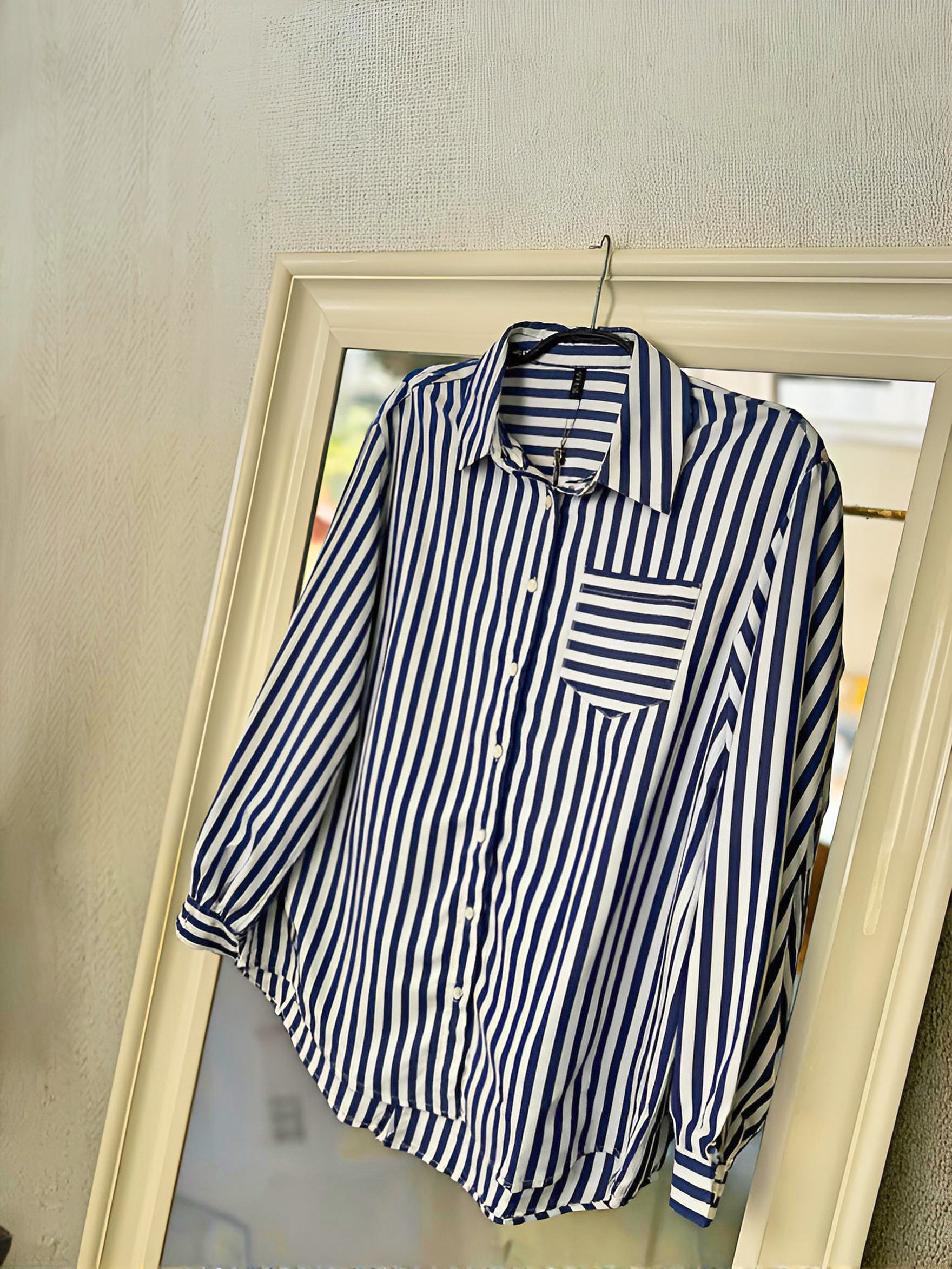 Camisa básica de fondo de armario en raya azul marino , abrochada por botones.