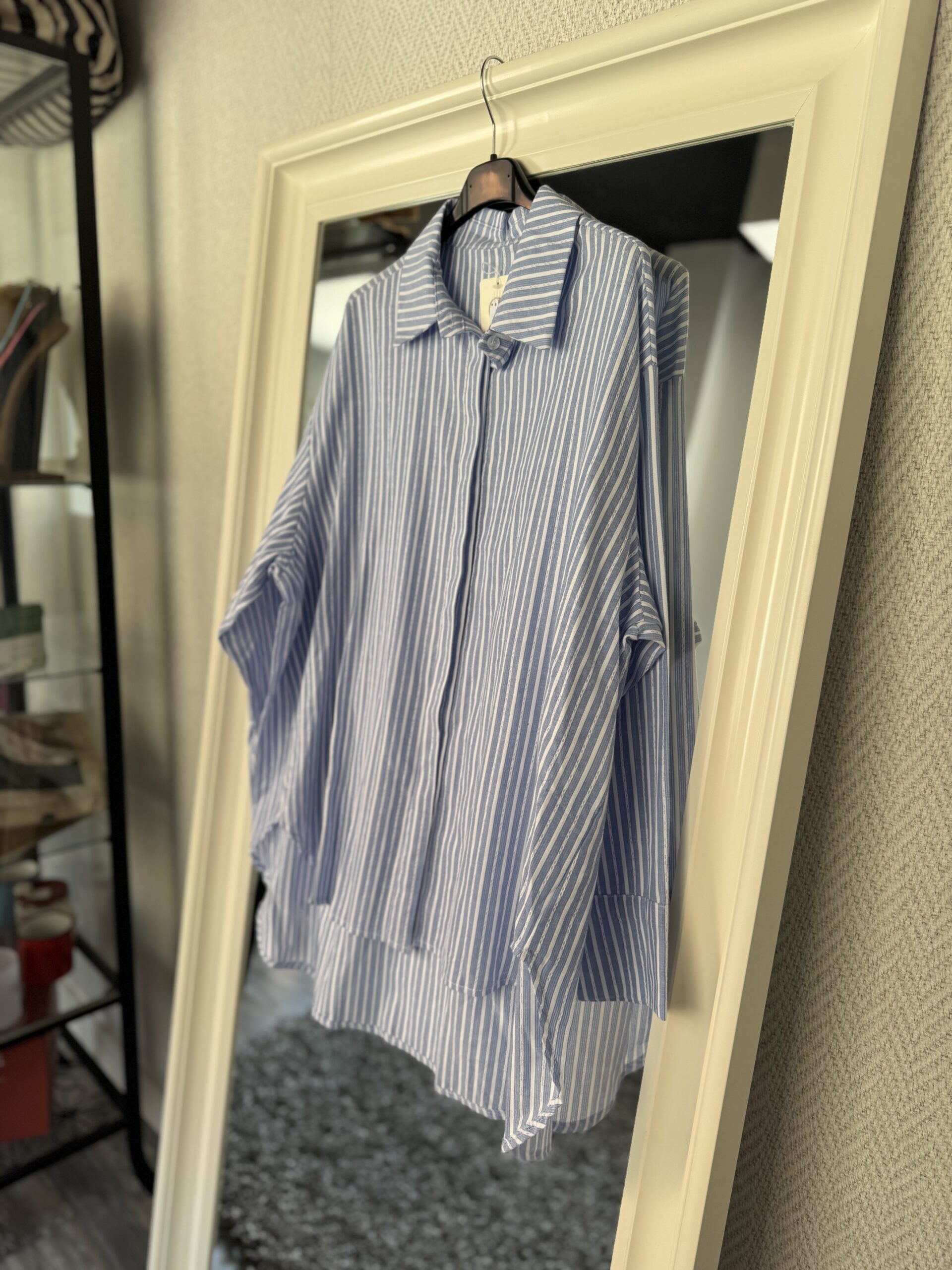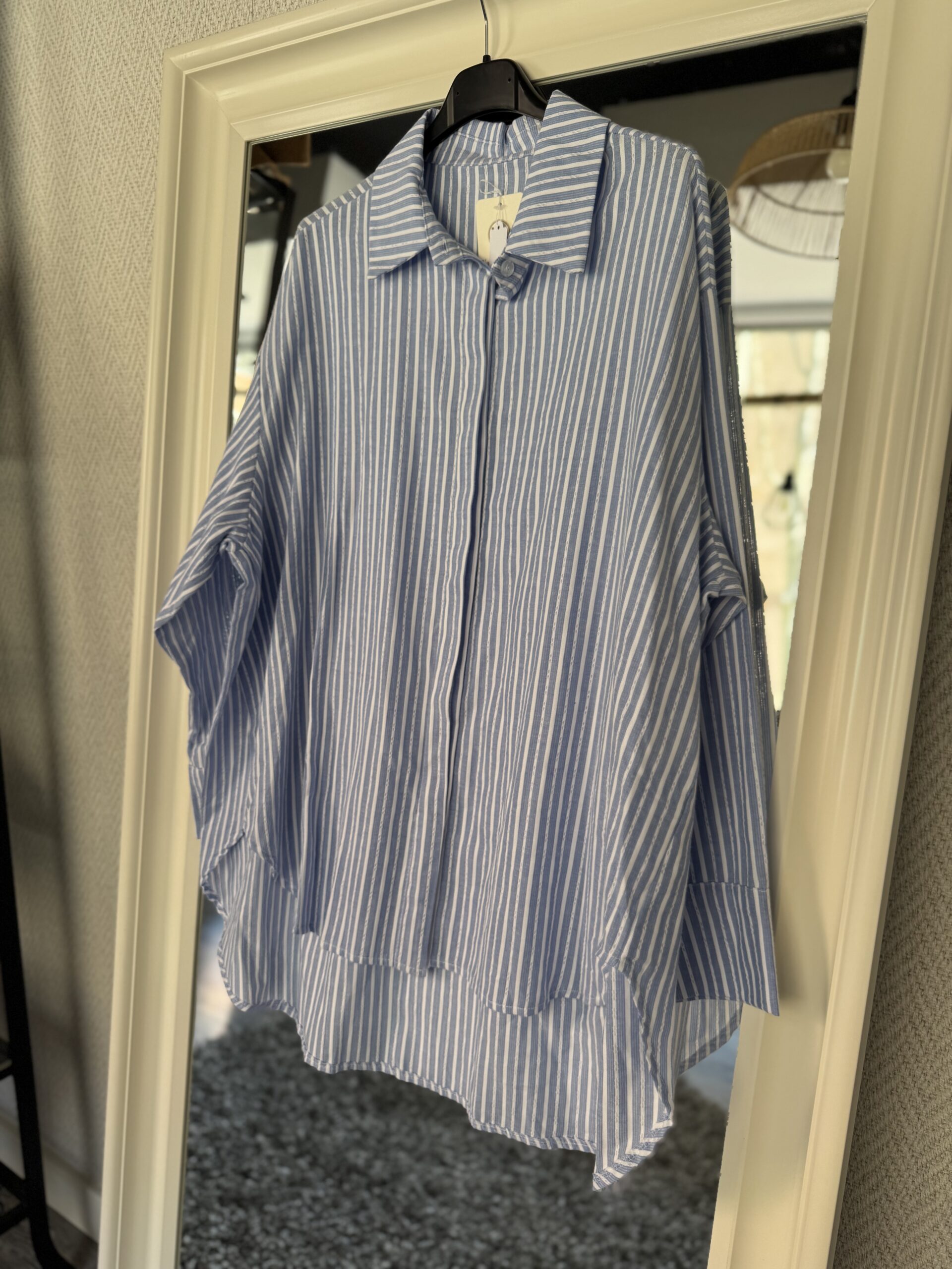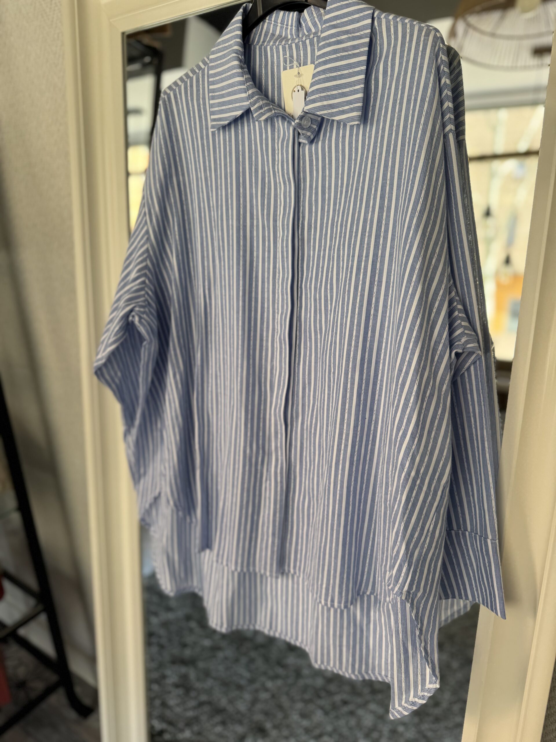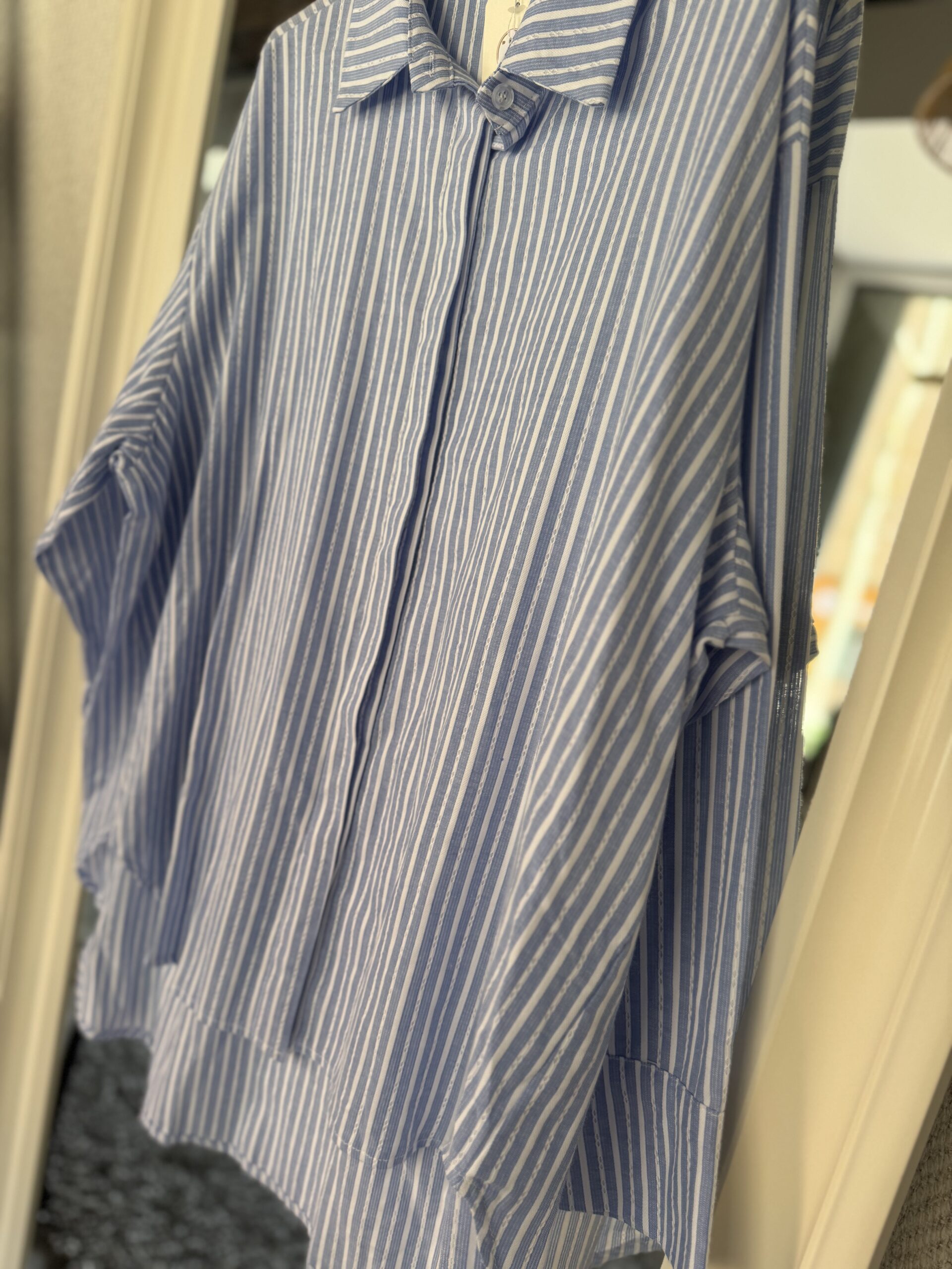 Esta camisa es de estilo oversize con estampado de rayas verticales en tonos azul y blanco . El diseño destaca por su silueta amplia, cuello de solapa clásico y un bajo asimétrico que es más largo en la parte trasera.