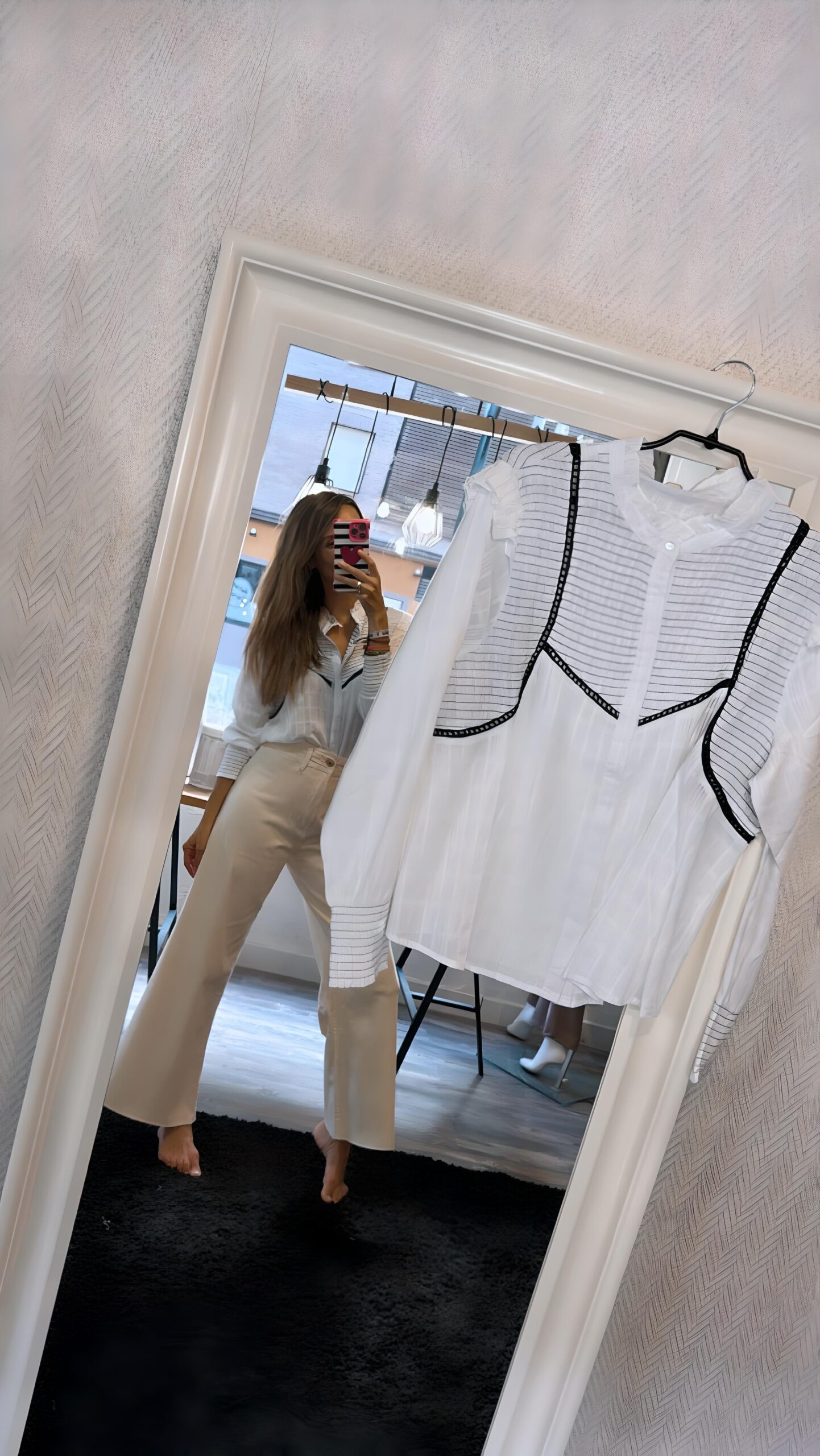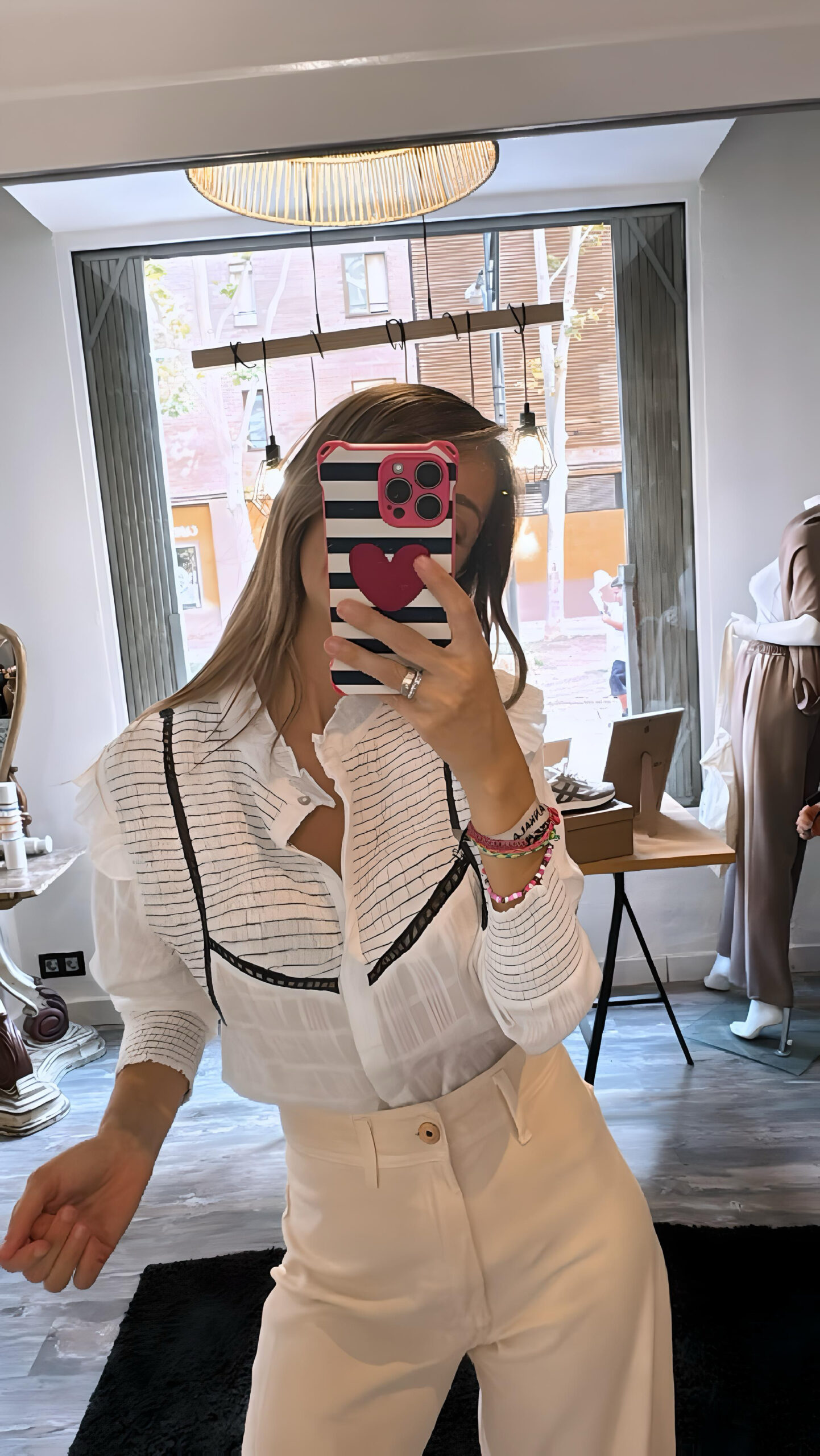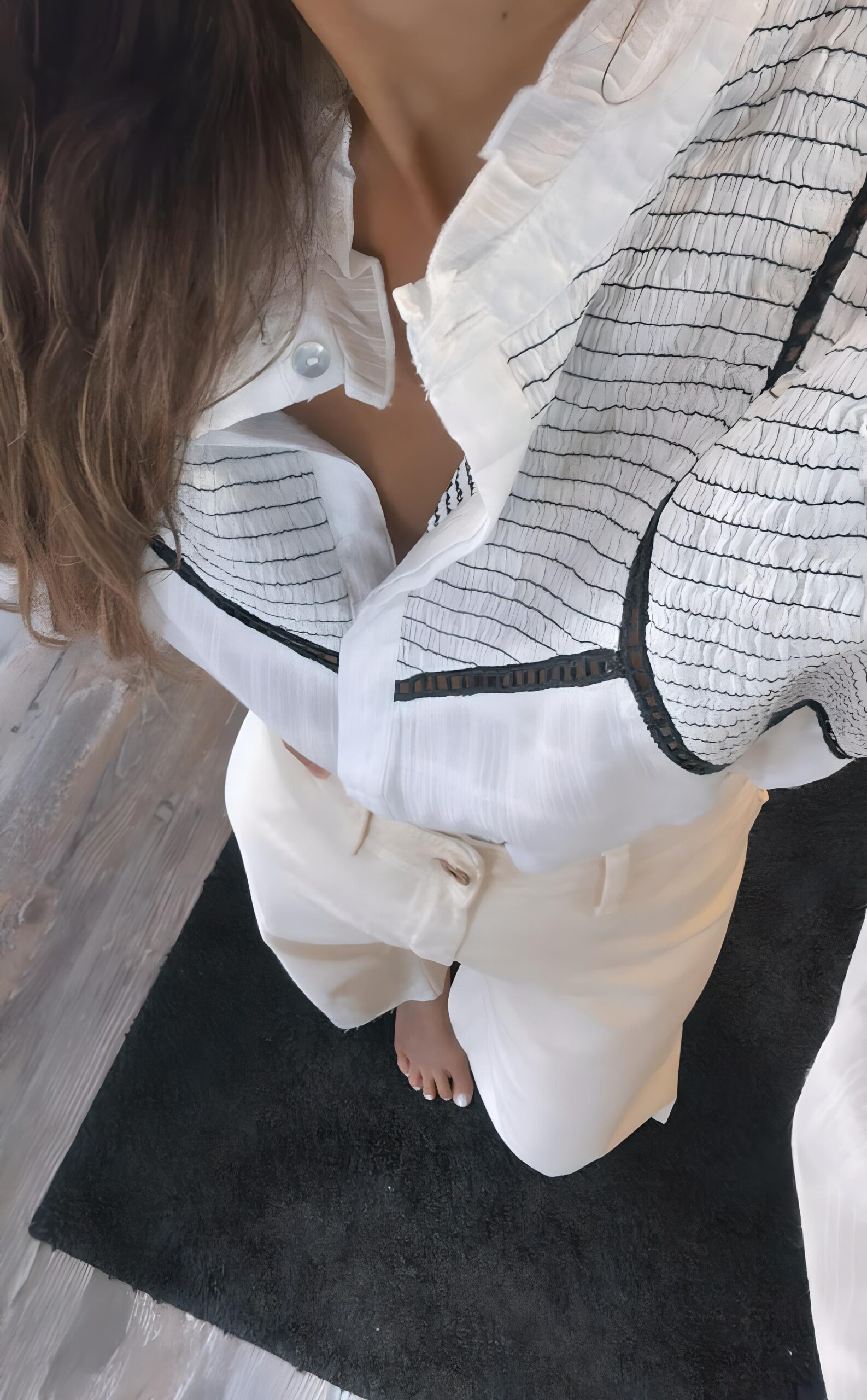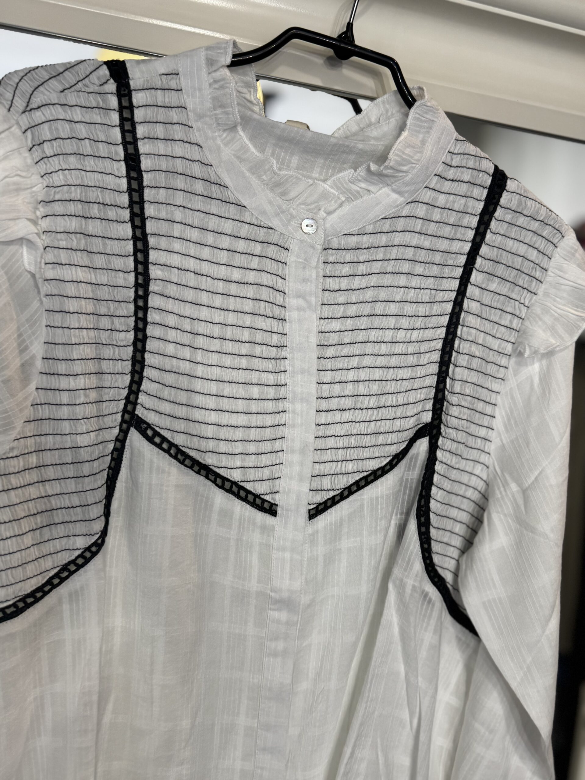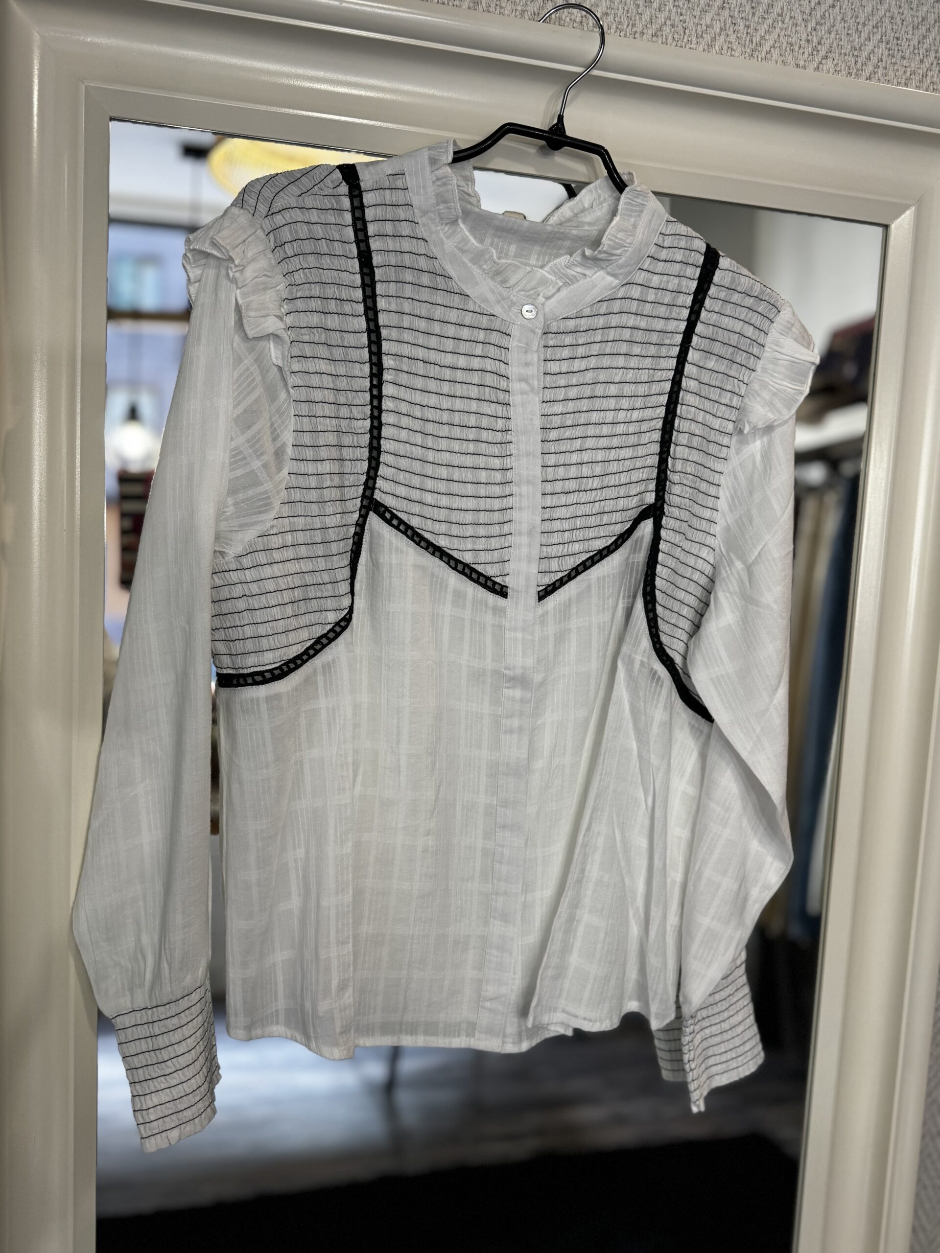 Camisa de manga larga con nido de abejo y ribete en bordados.