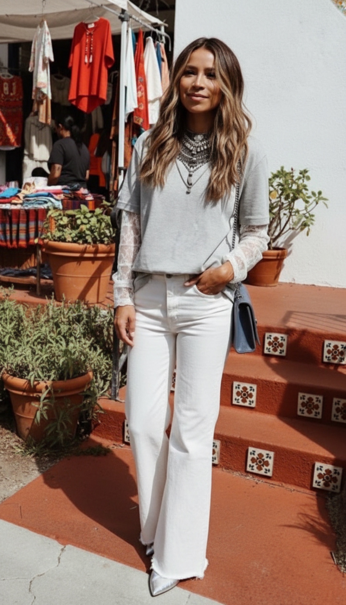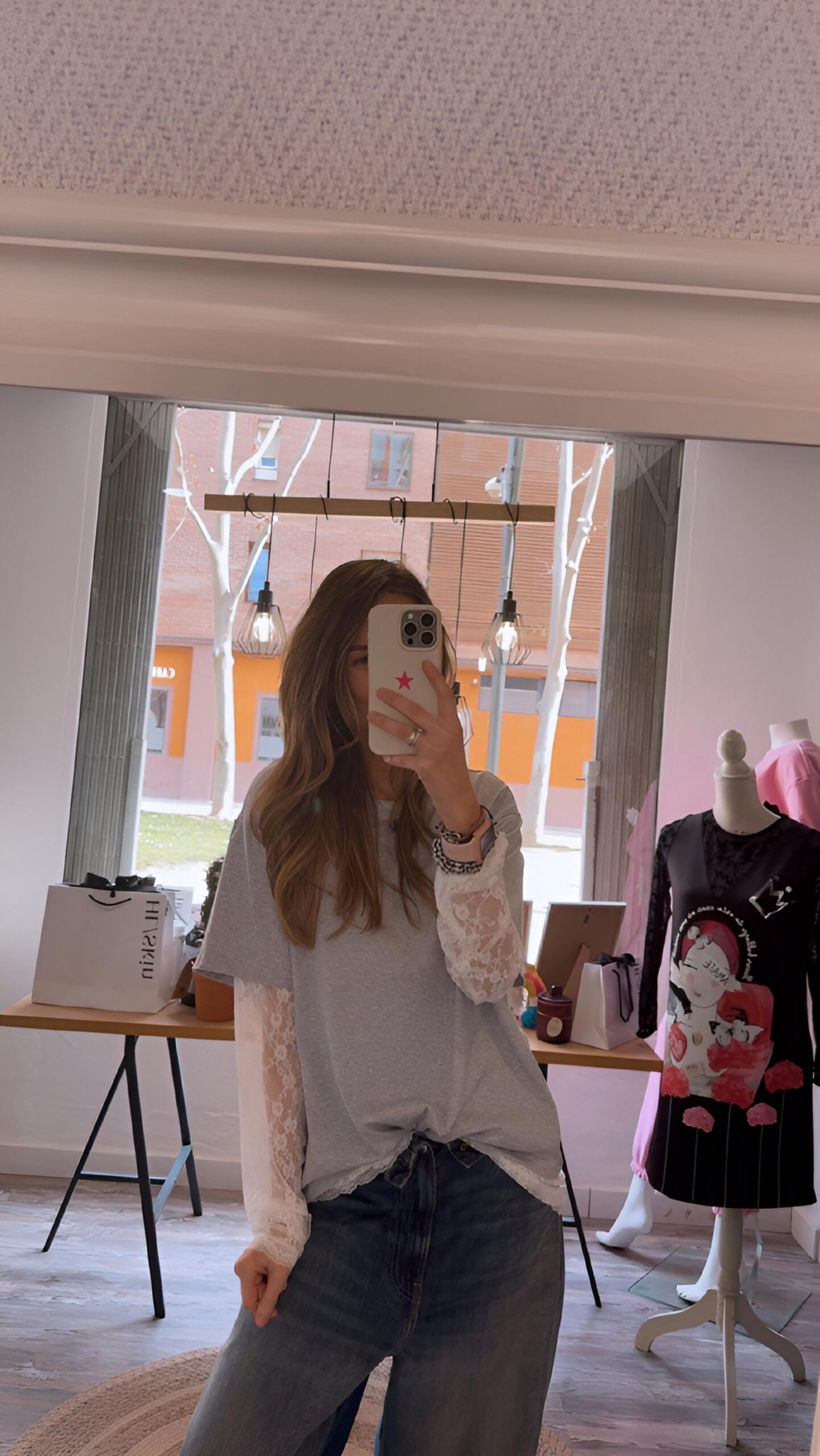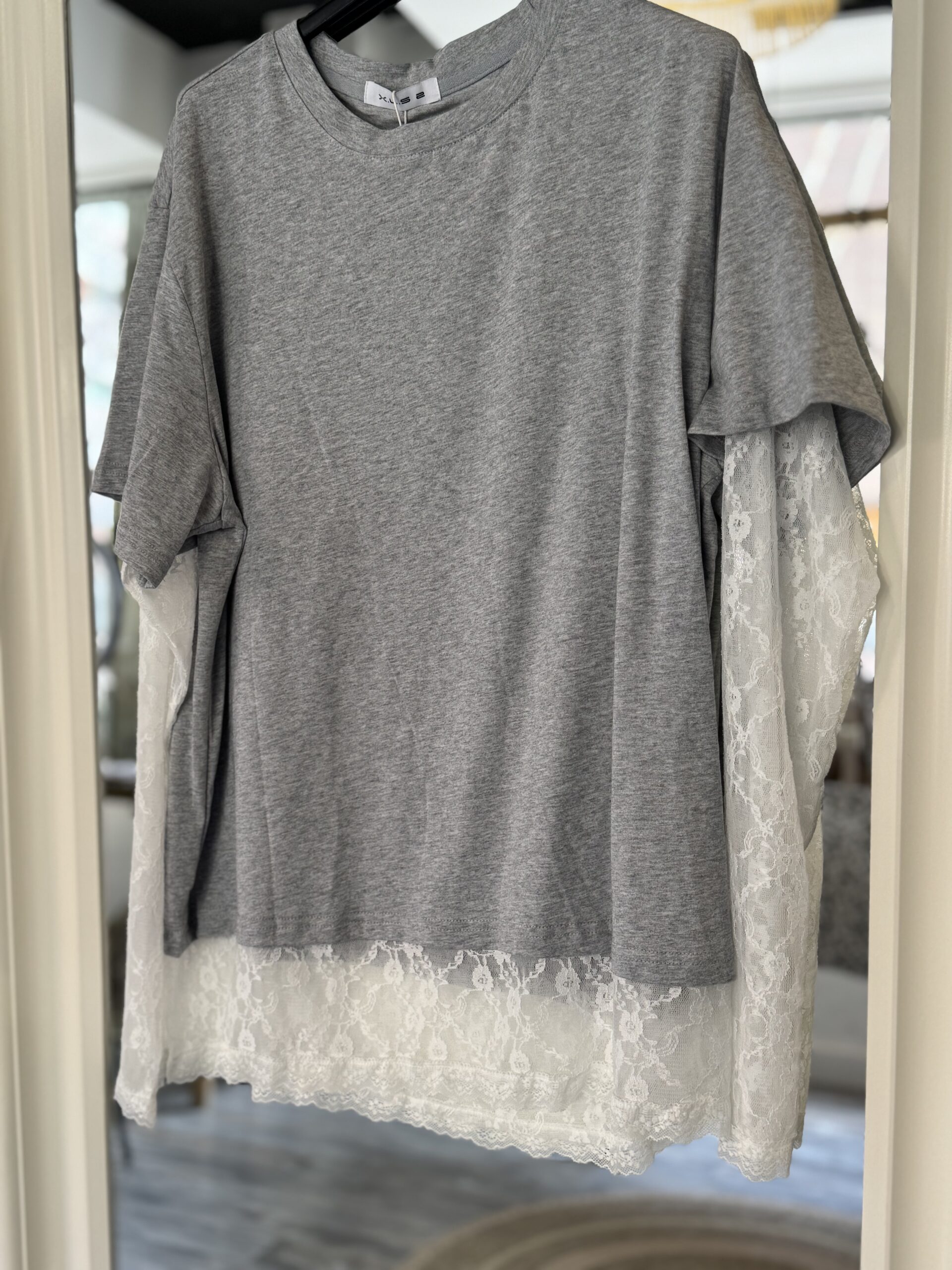 Camiseta de algodón en color gris con detalles de encaje en brazos y bajo.
