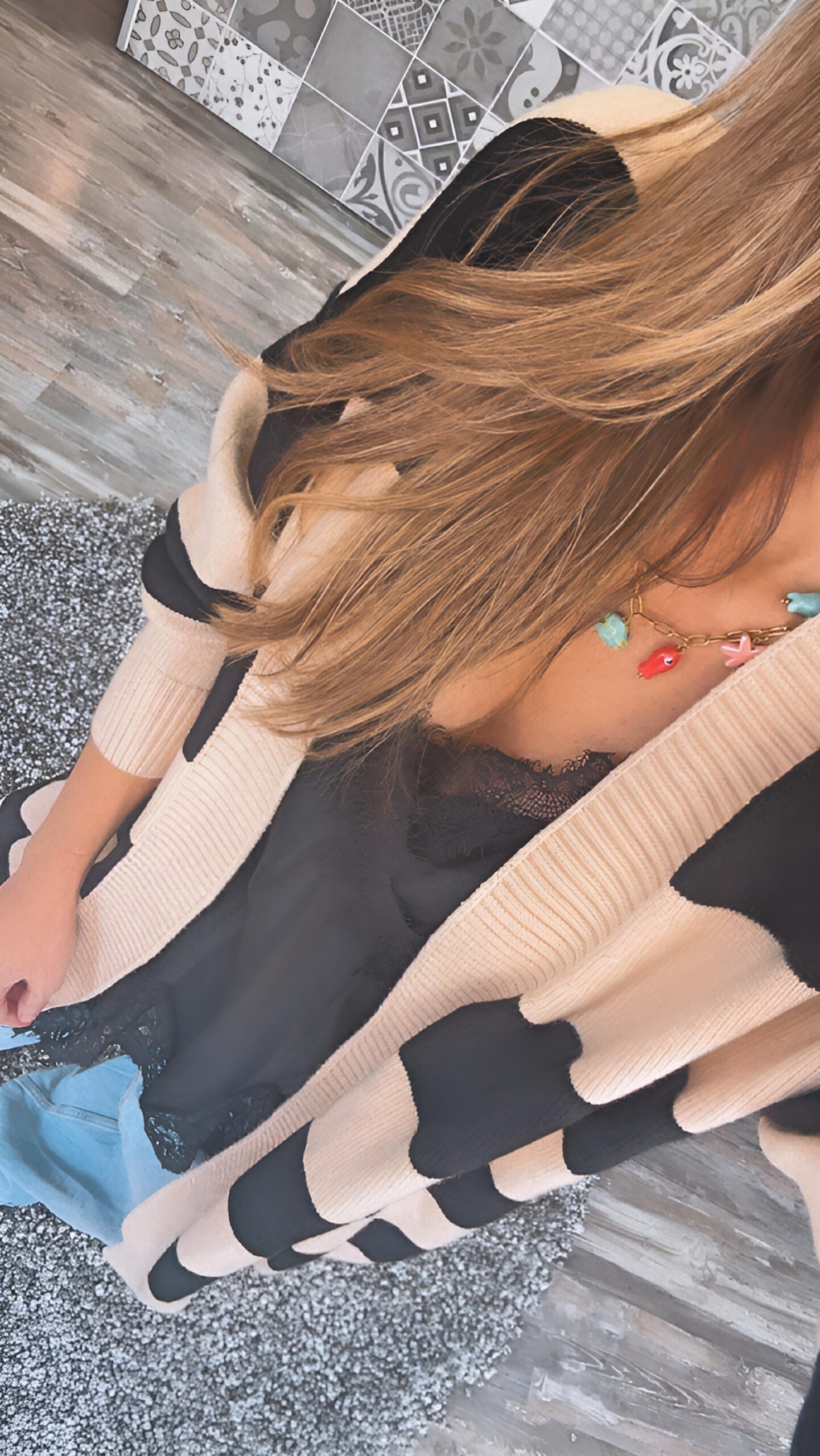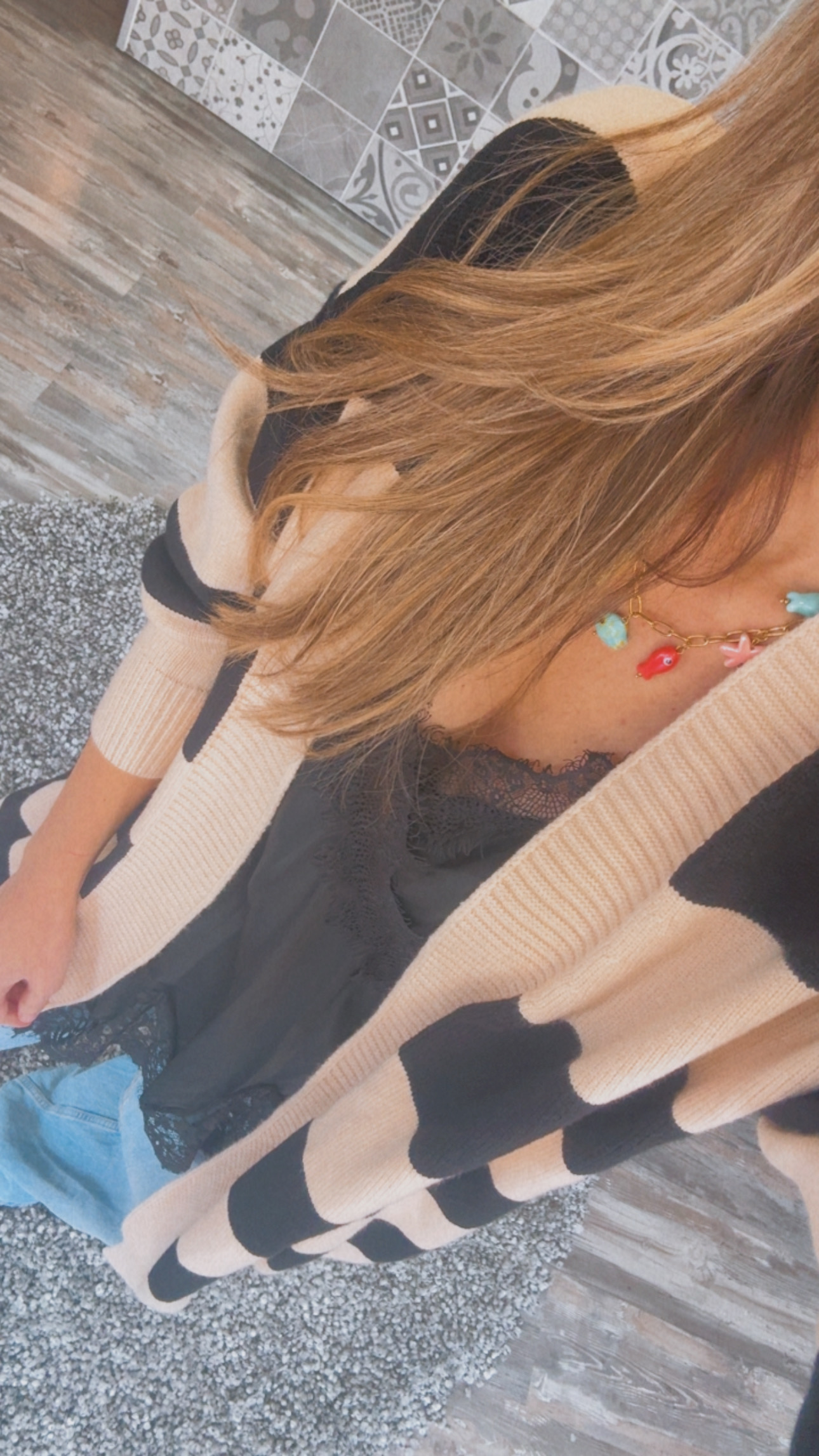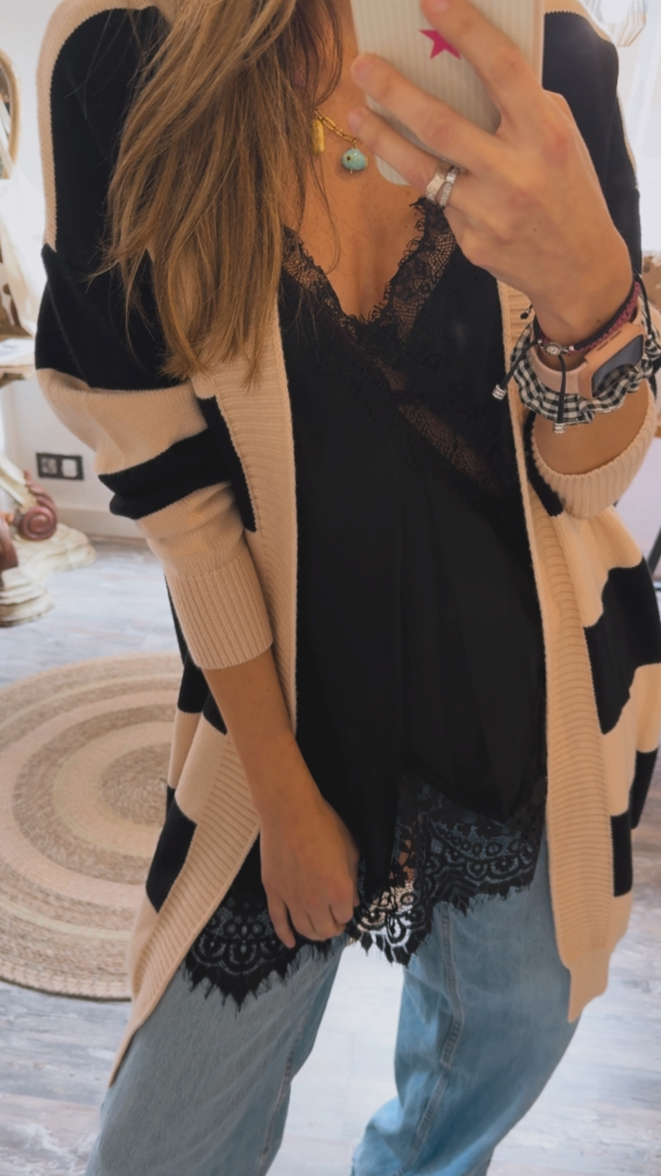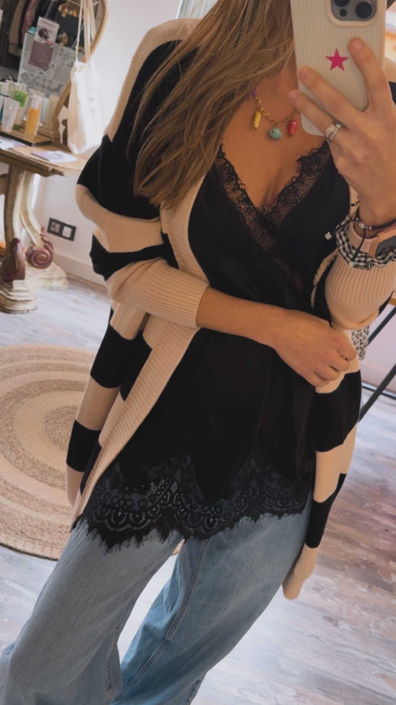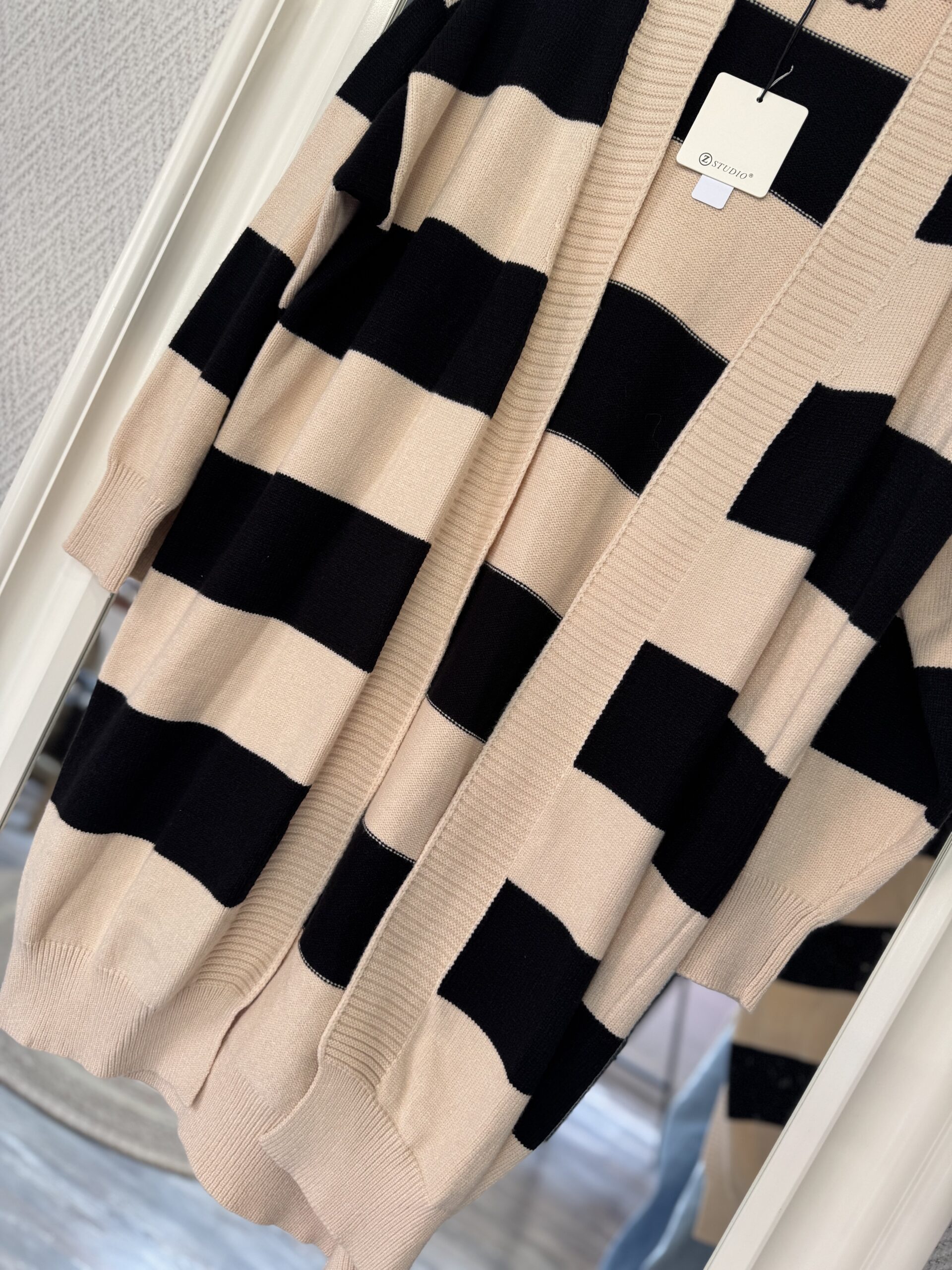Chaqueta larga de rayas abierta, en tonos beige clarito y negro.