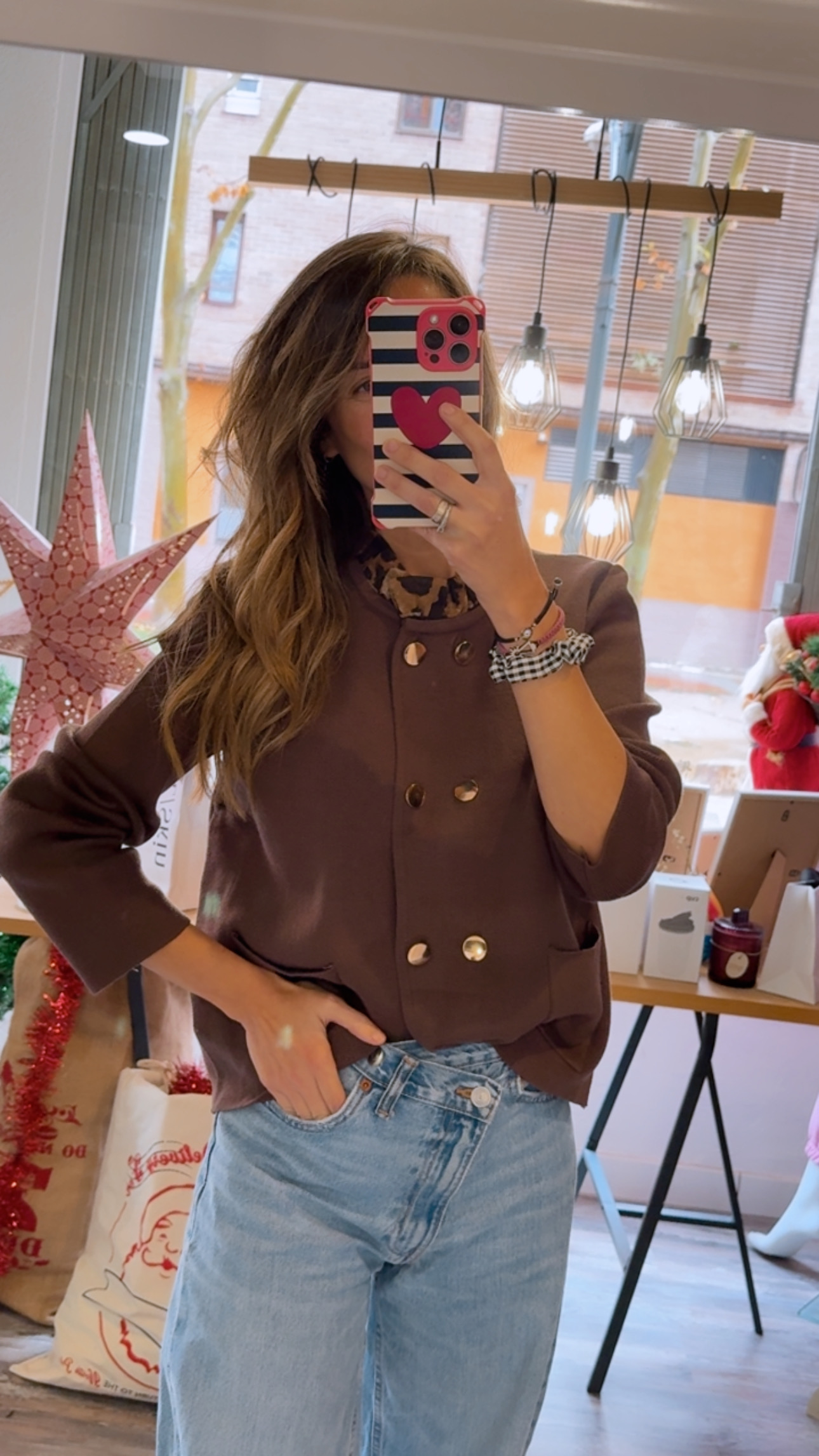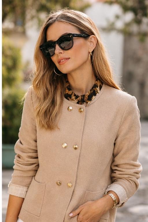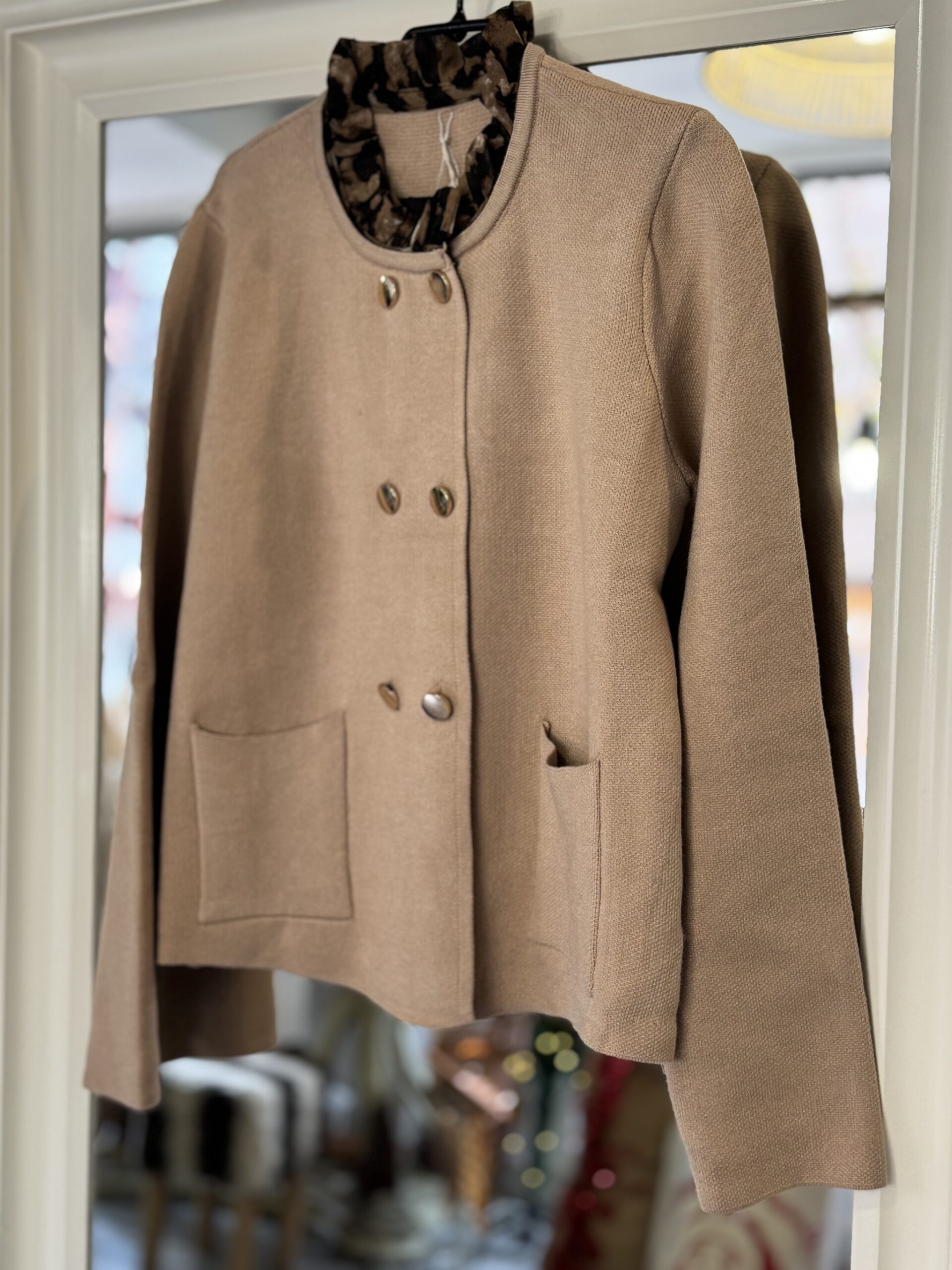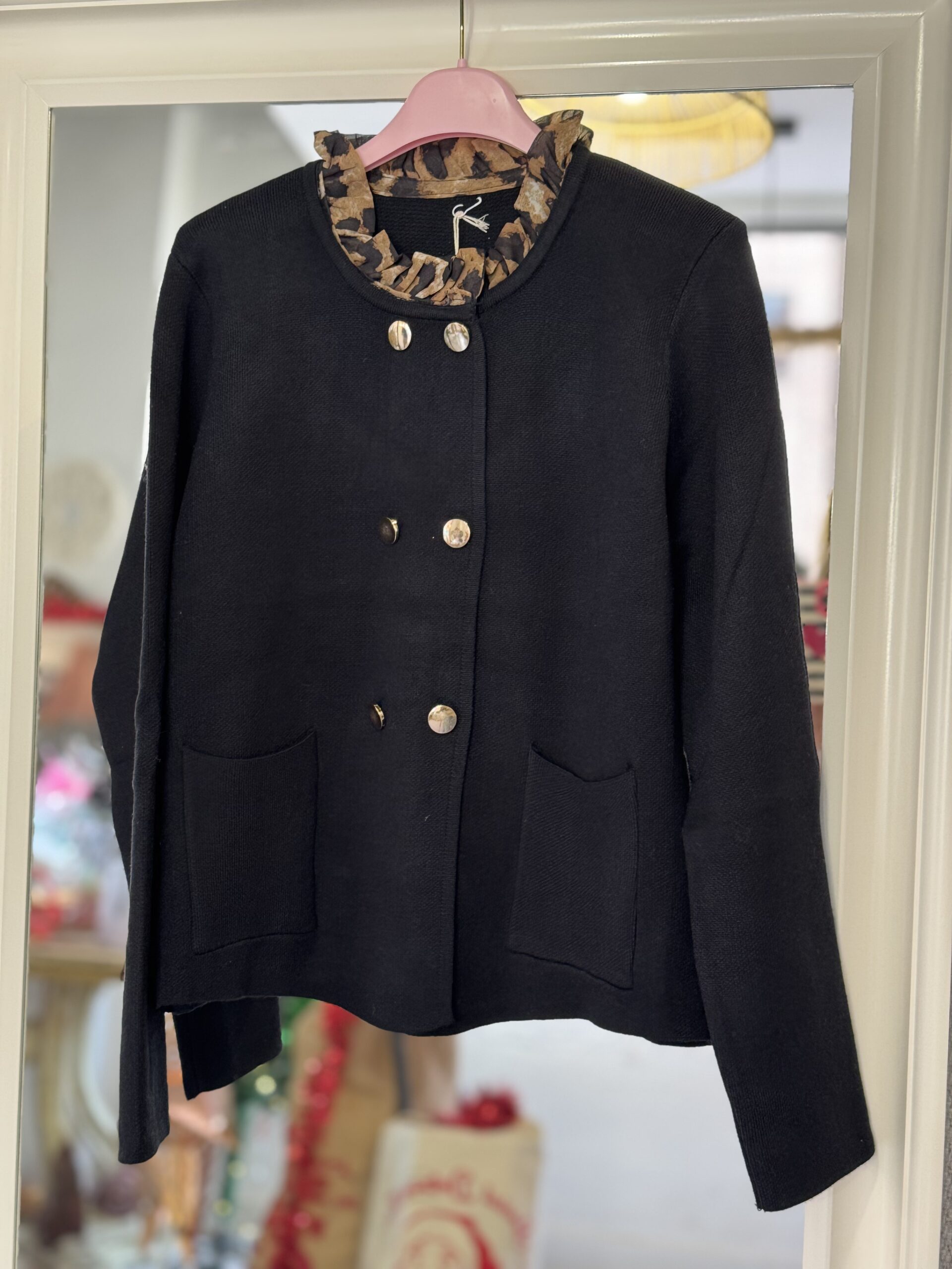Chaqueta tipo chanelita abrochada por botones con detalle del cuello en tejido print animal.