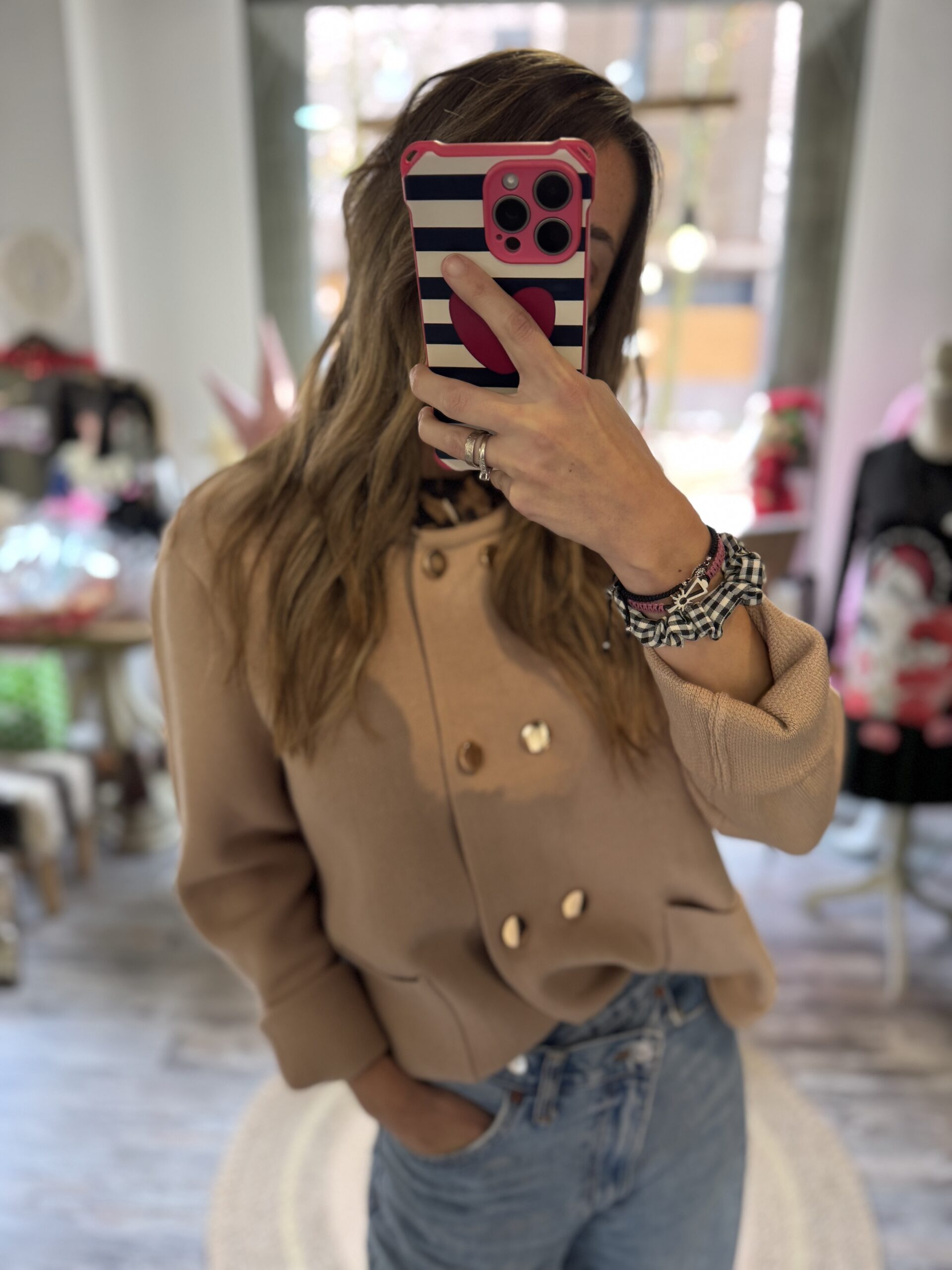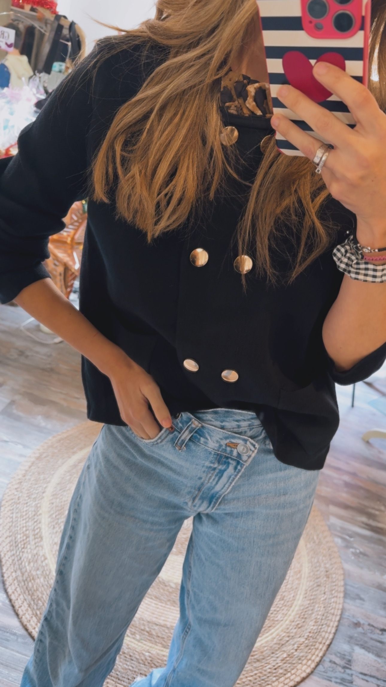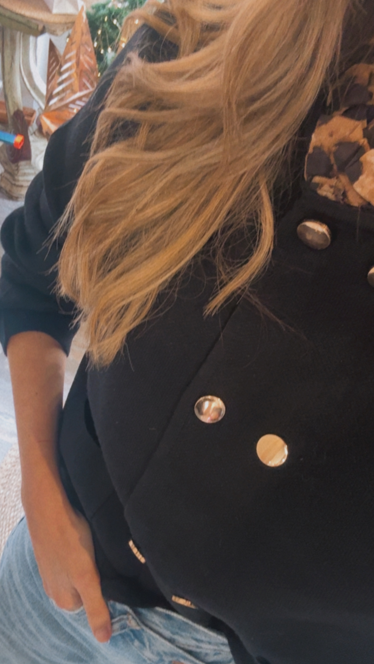 Chaqueta tipo chanelita abrochada por botones con detalle del cuello en tejido print animal.