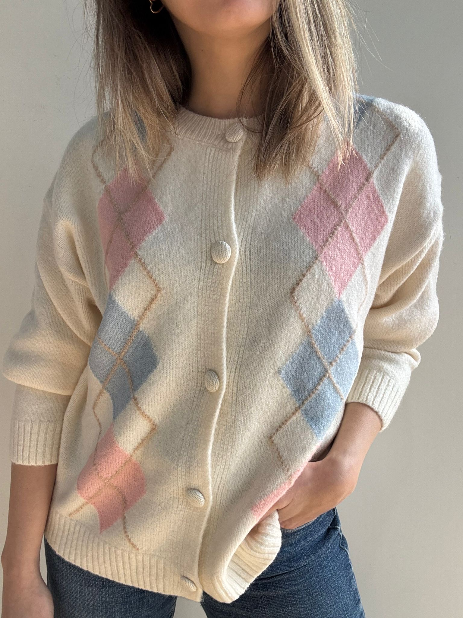 Chaqueta de rombos en tonos pastel, abrochada por botones.