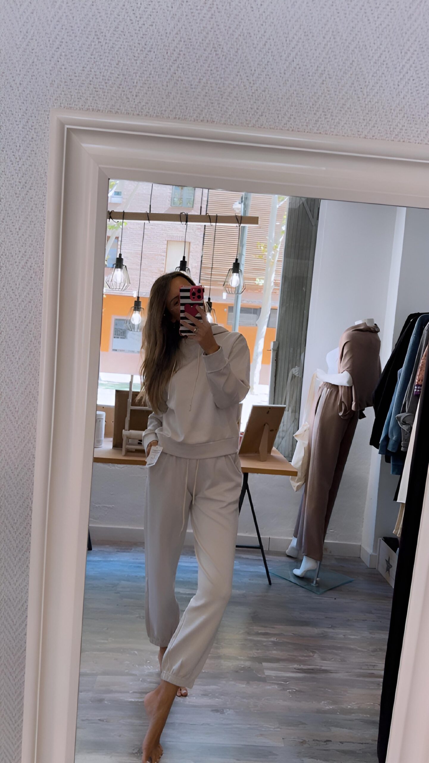 Conjunto deportivo formado por sudadadera de manga larga y cuello capucha.  Es de corte holgado y confeccionada en tejido fluido.