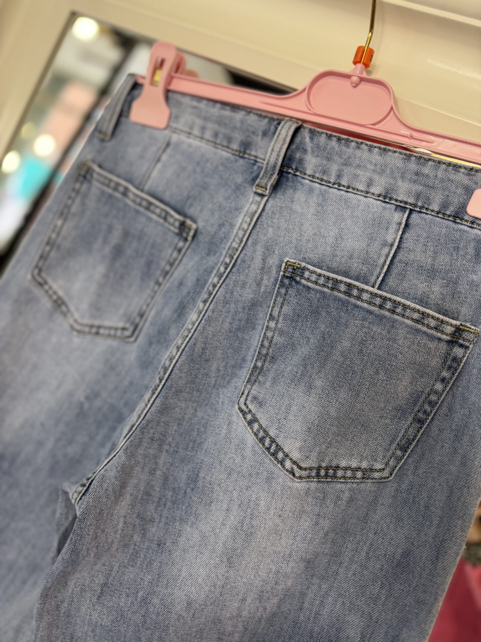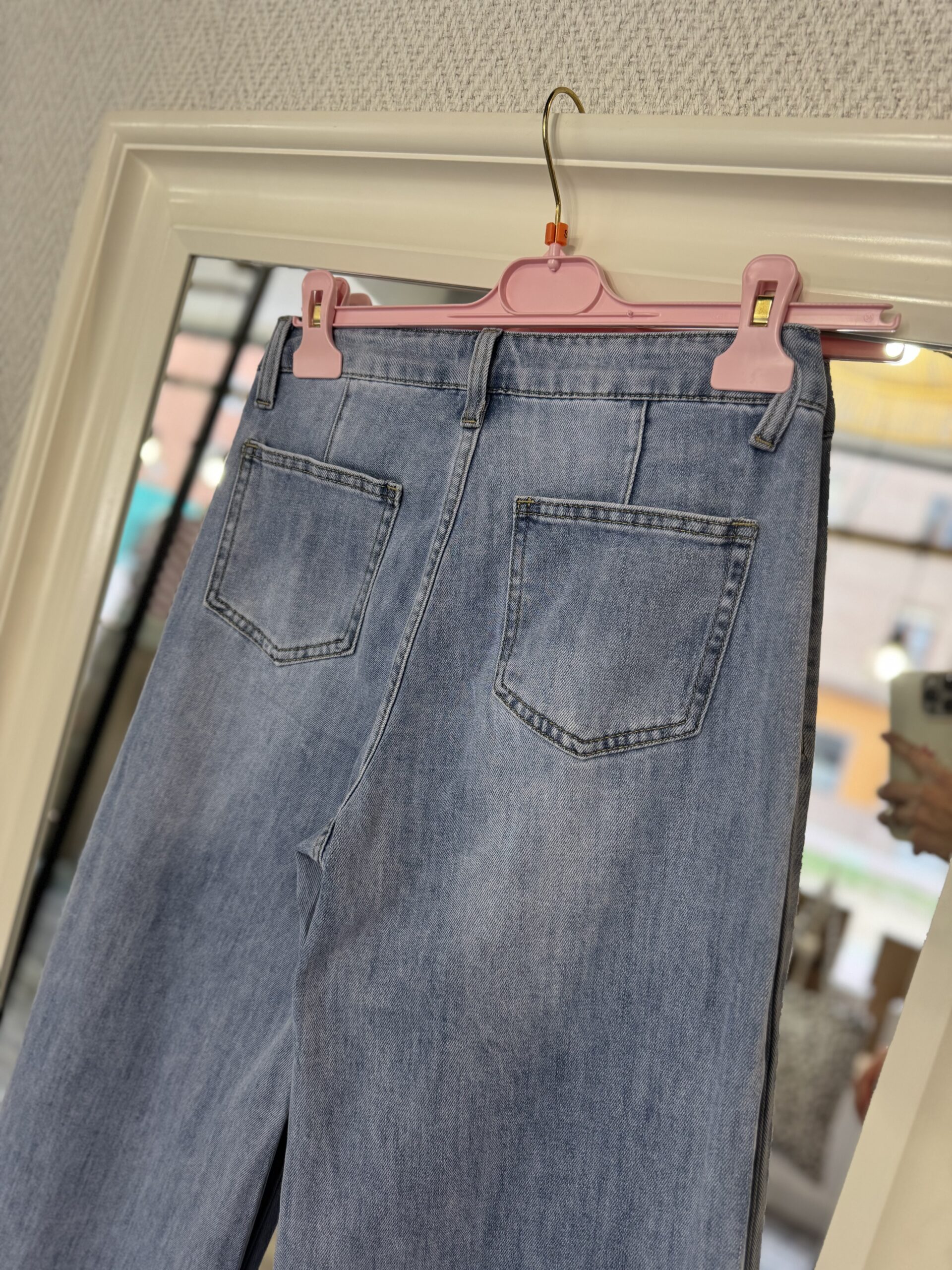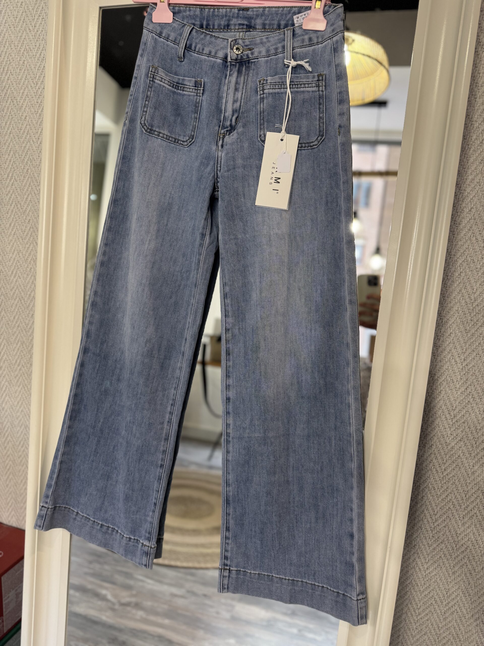 Pantalones jeans con bolsillos delanteros y pernera ancha.