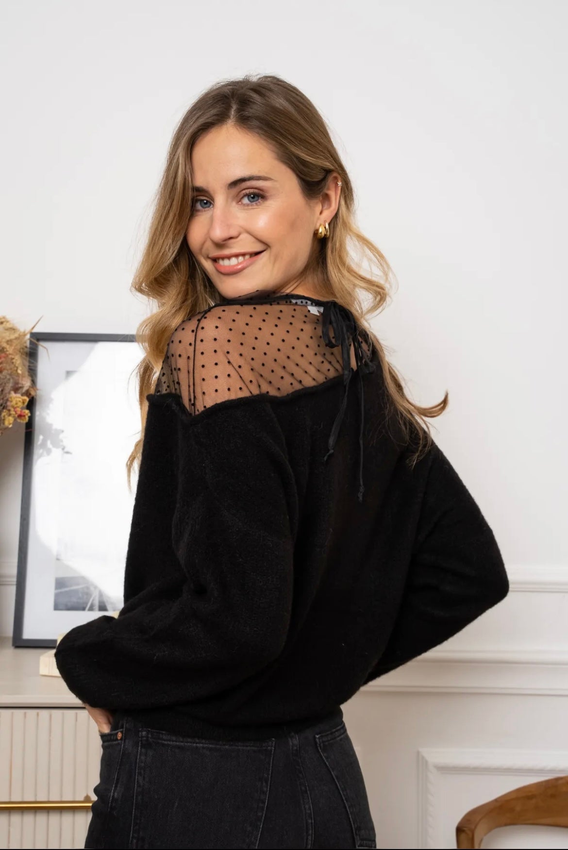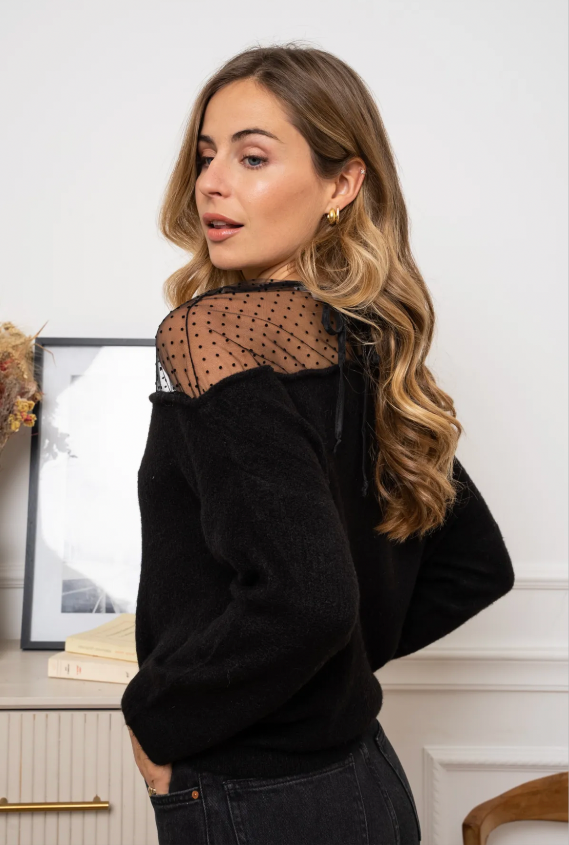 Jersey con detalle de tul plumeti en el lateral ( por delante y por detrás ) y cierre anudado en la espalda.