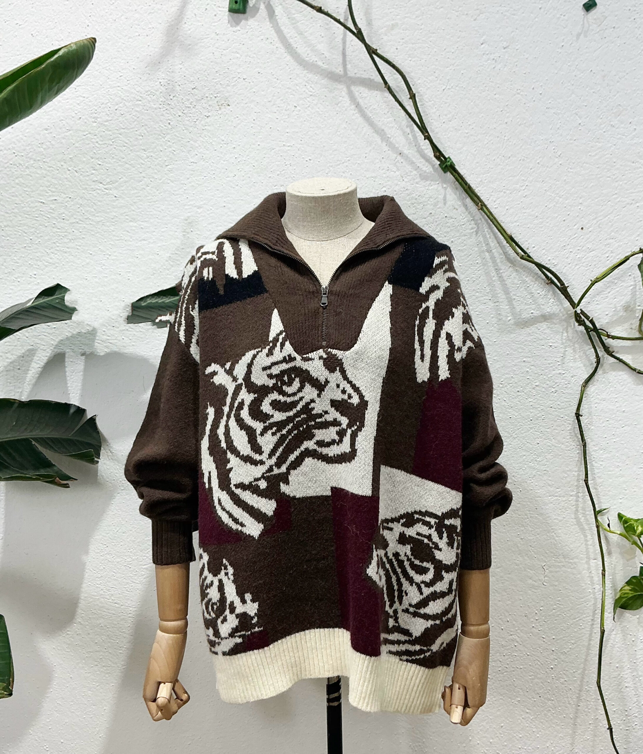 De corte amplio y cuello alto con cremallera, combinando colores marrón chocolate, burdeos y tonos tierra.