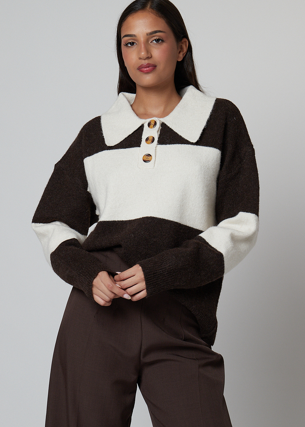 Jersey tipo polo con cuello y botones en la parte delantera , de manga larga, en tonos tierra.