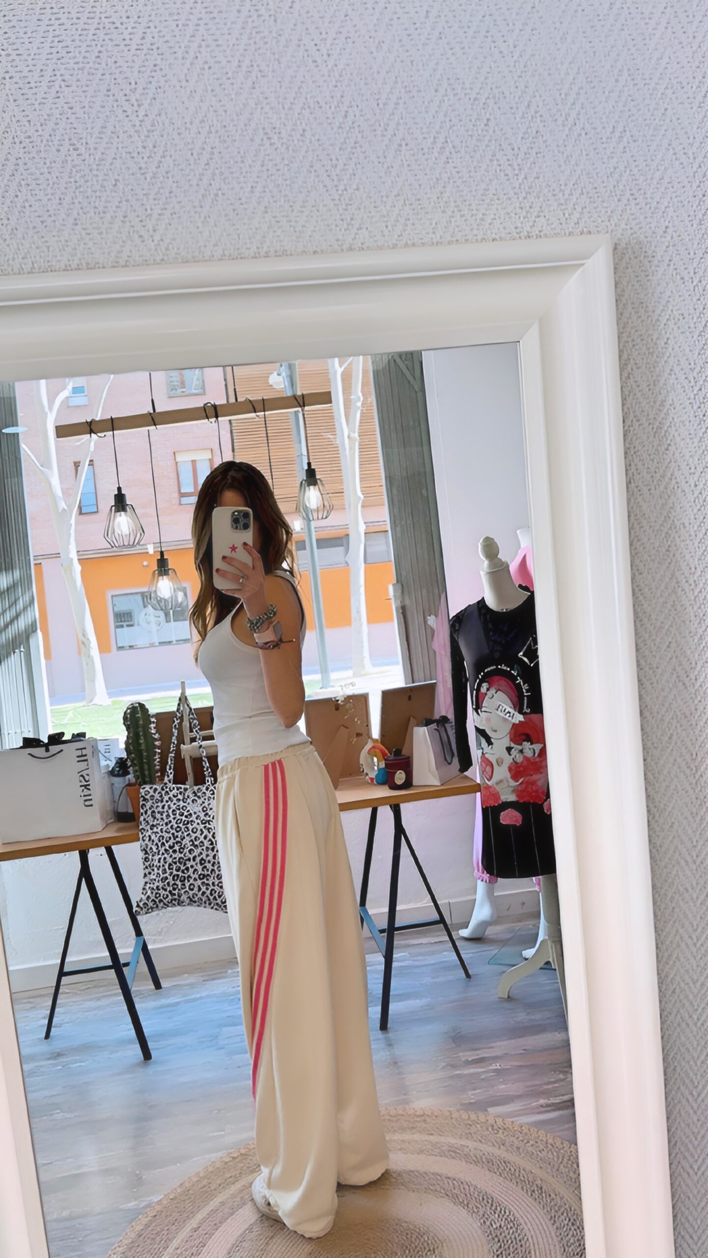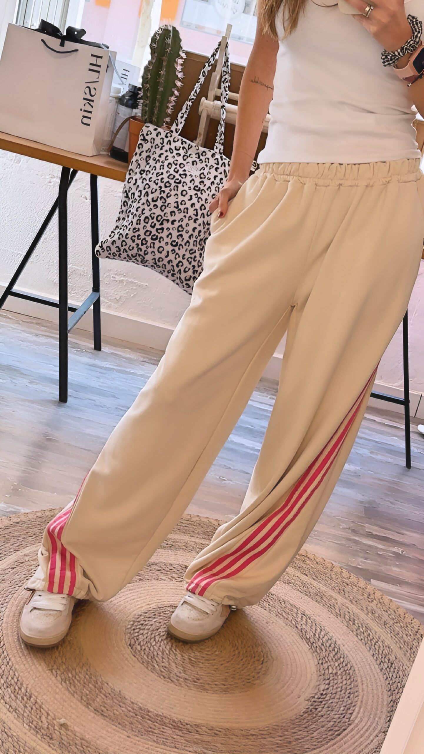 Pantalón de chandal color beige con detalle de rayas verticales en los laterales. Diseño de pierna ancha.