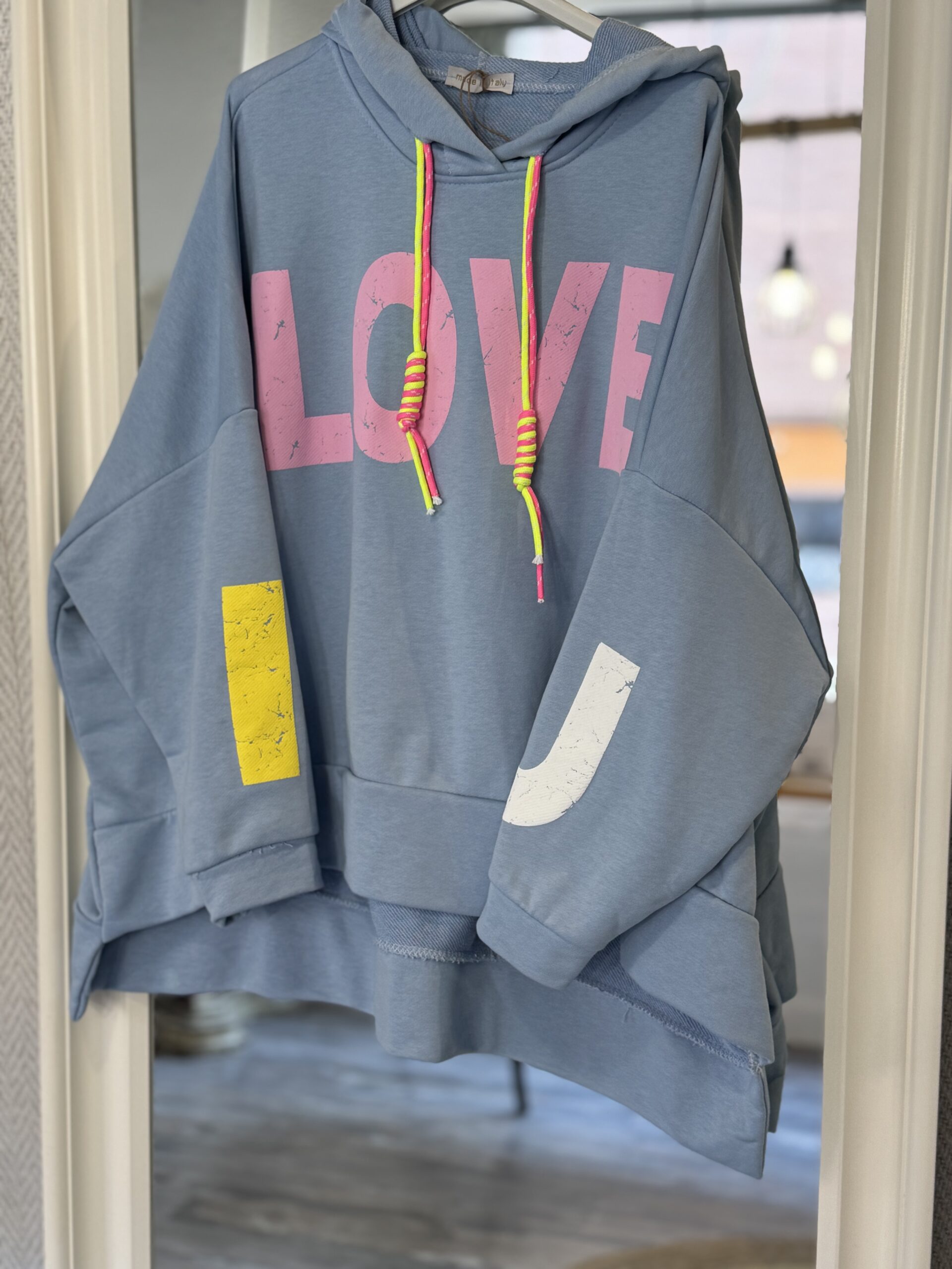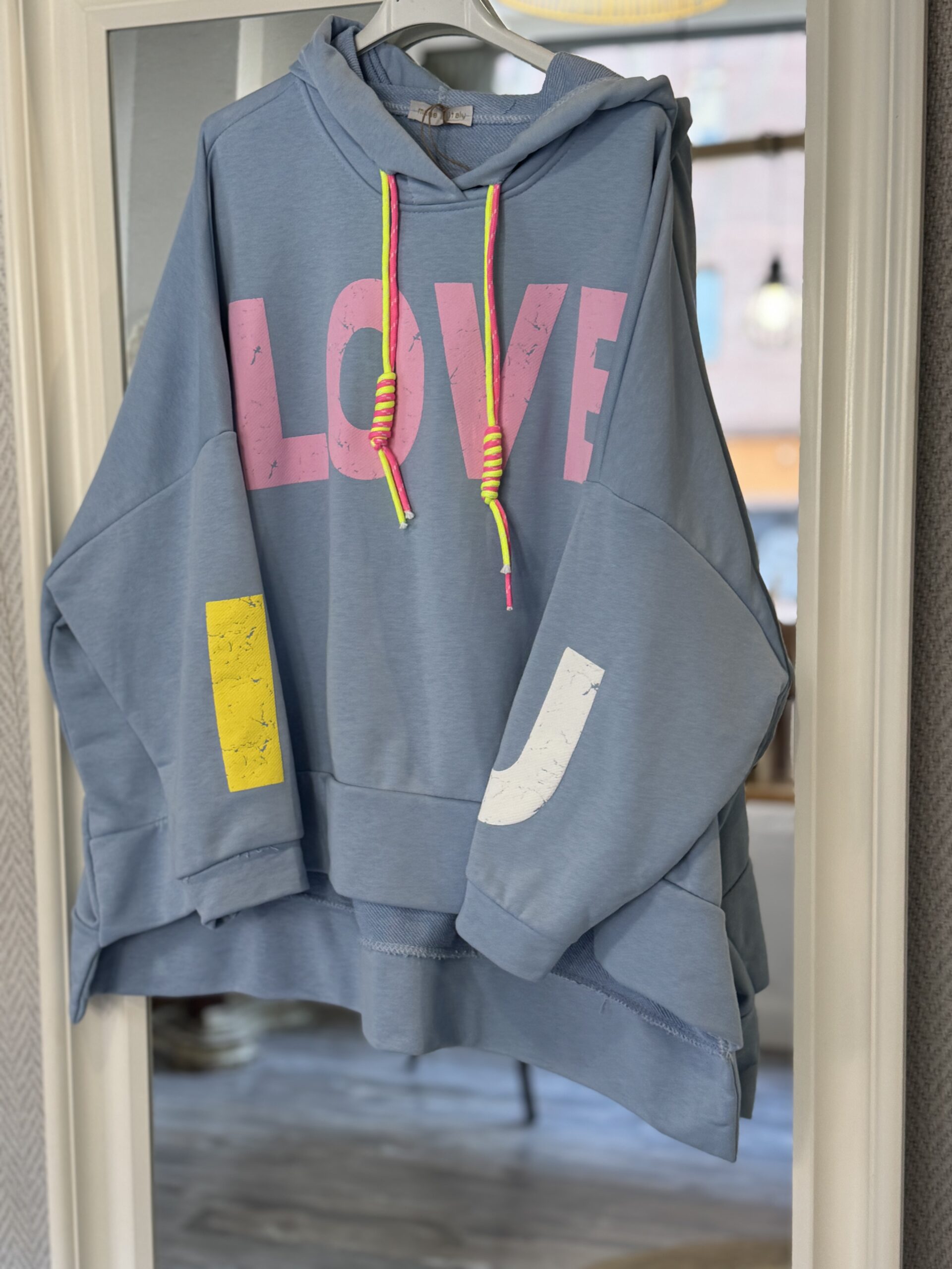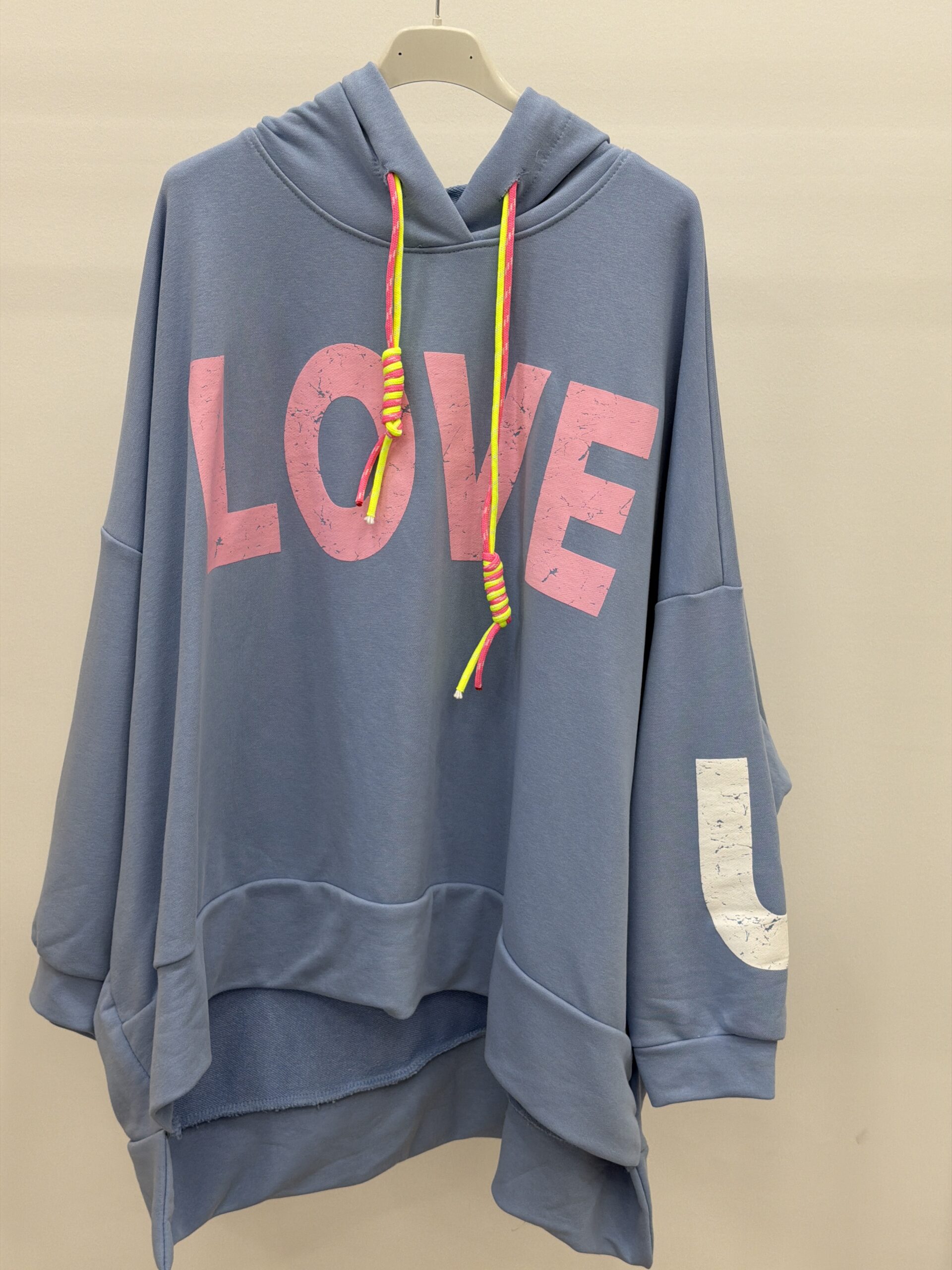 Sudadera oversize asimétrica, más larga por detrás que por delante y con detalles en flúor.