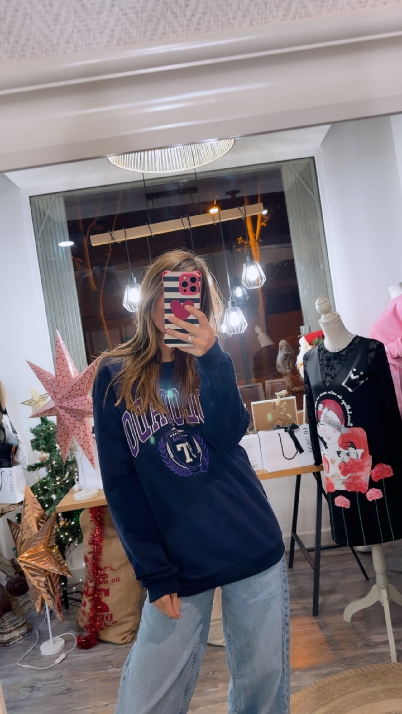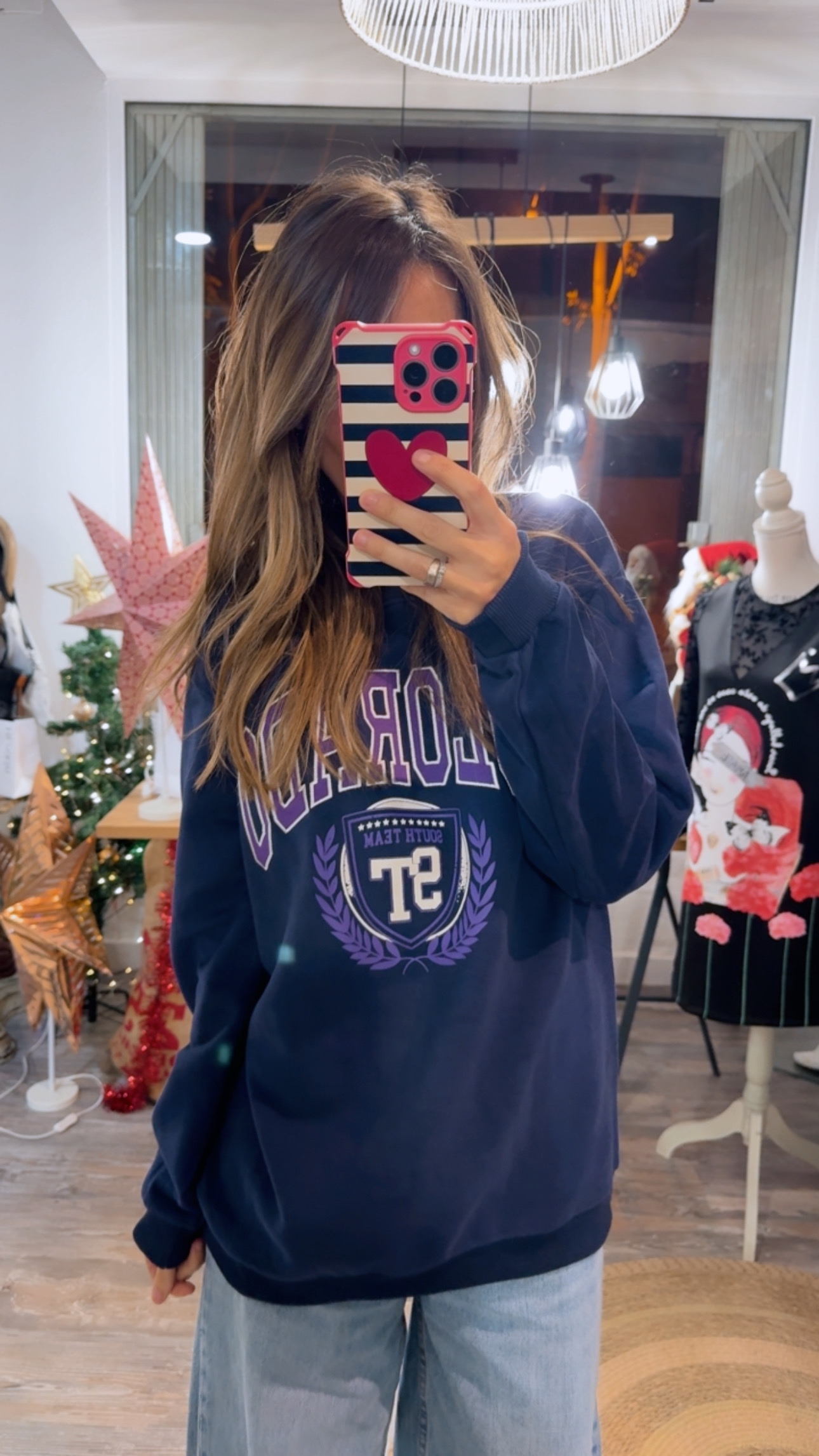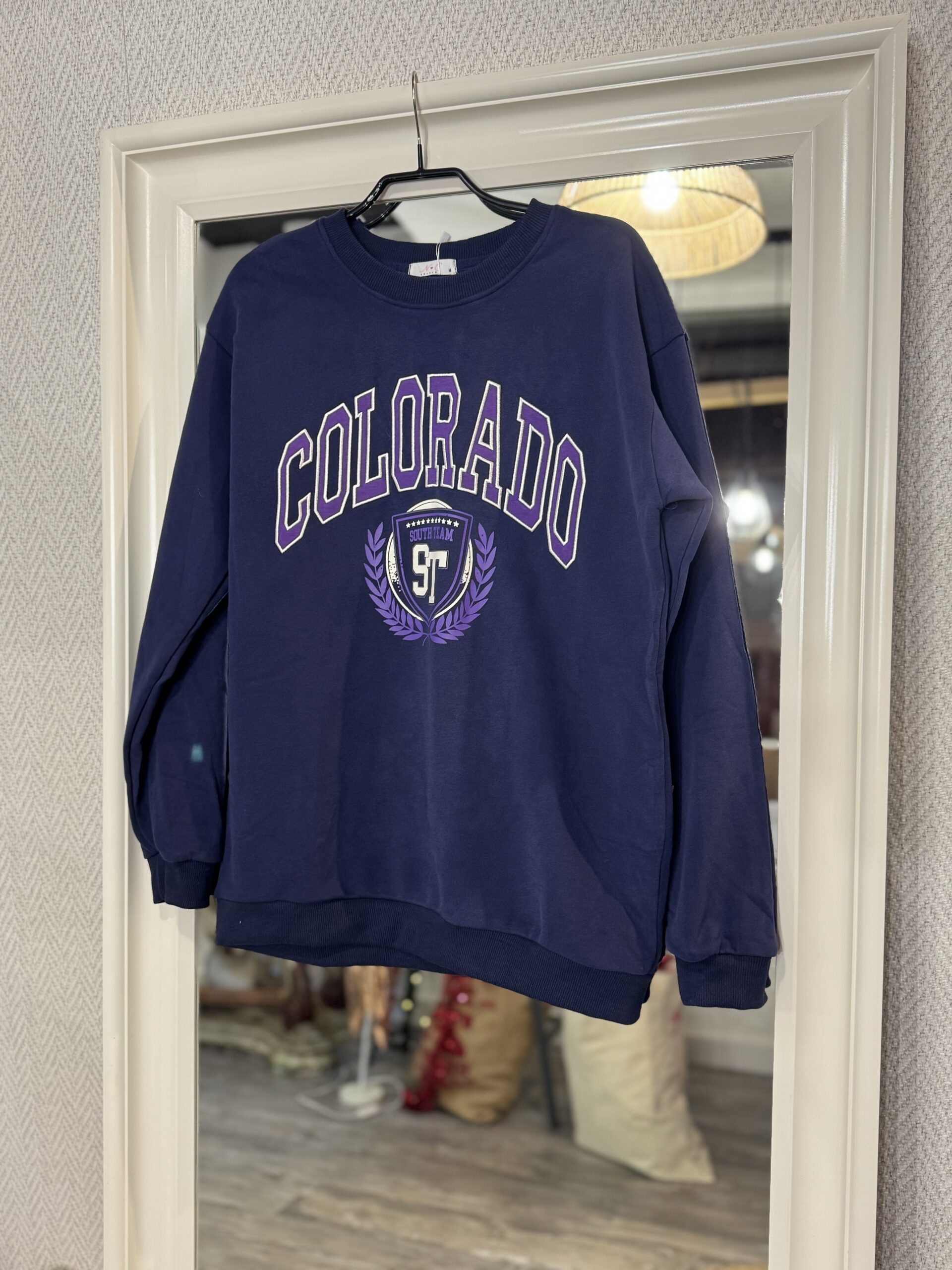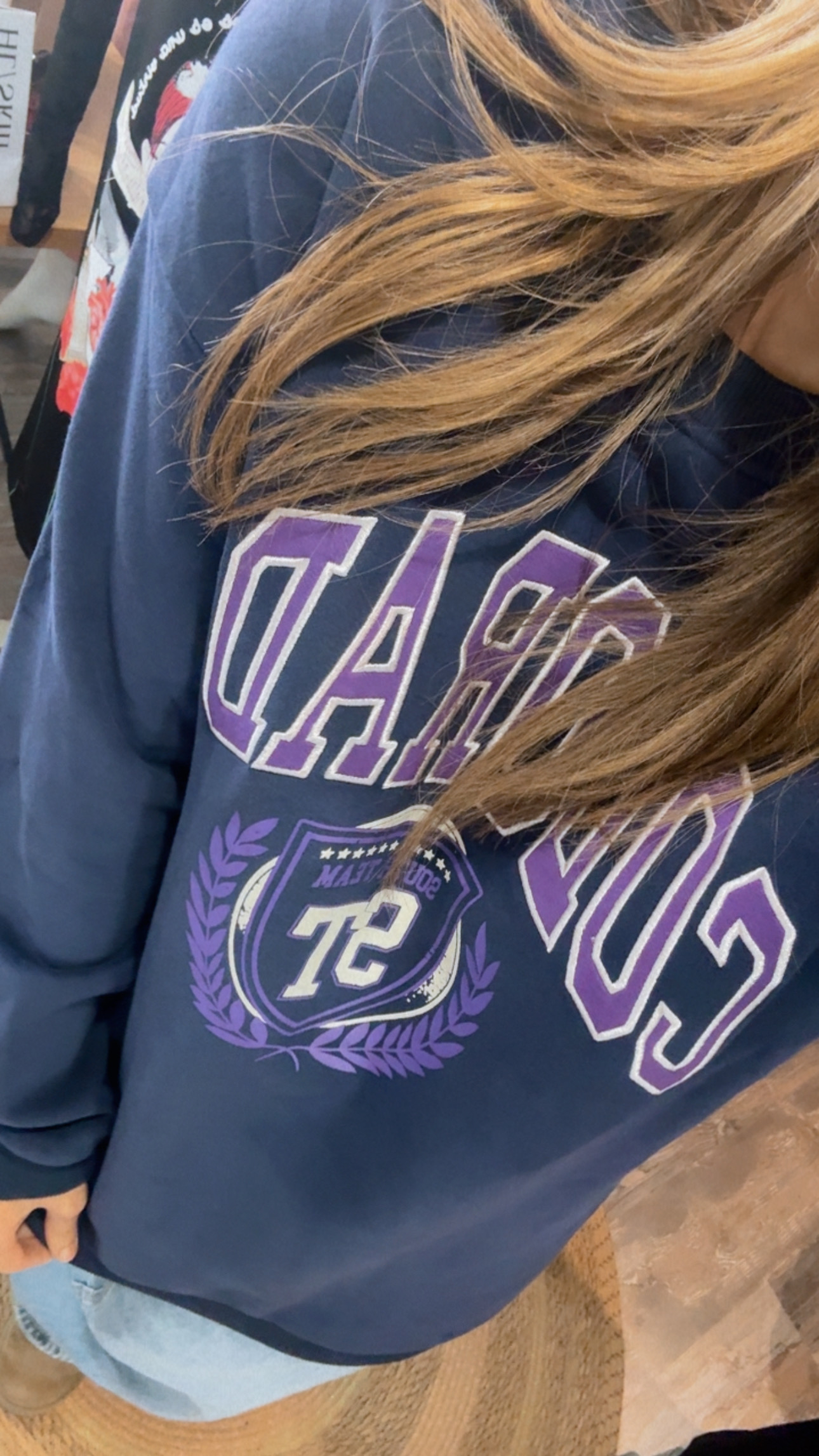 Sudadera con dibujo y texto en color morado.