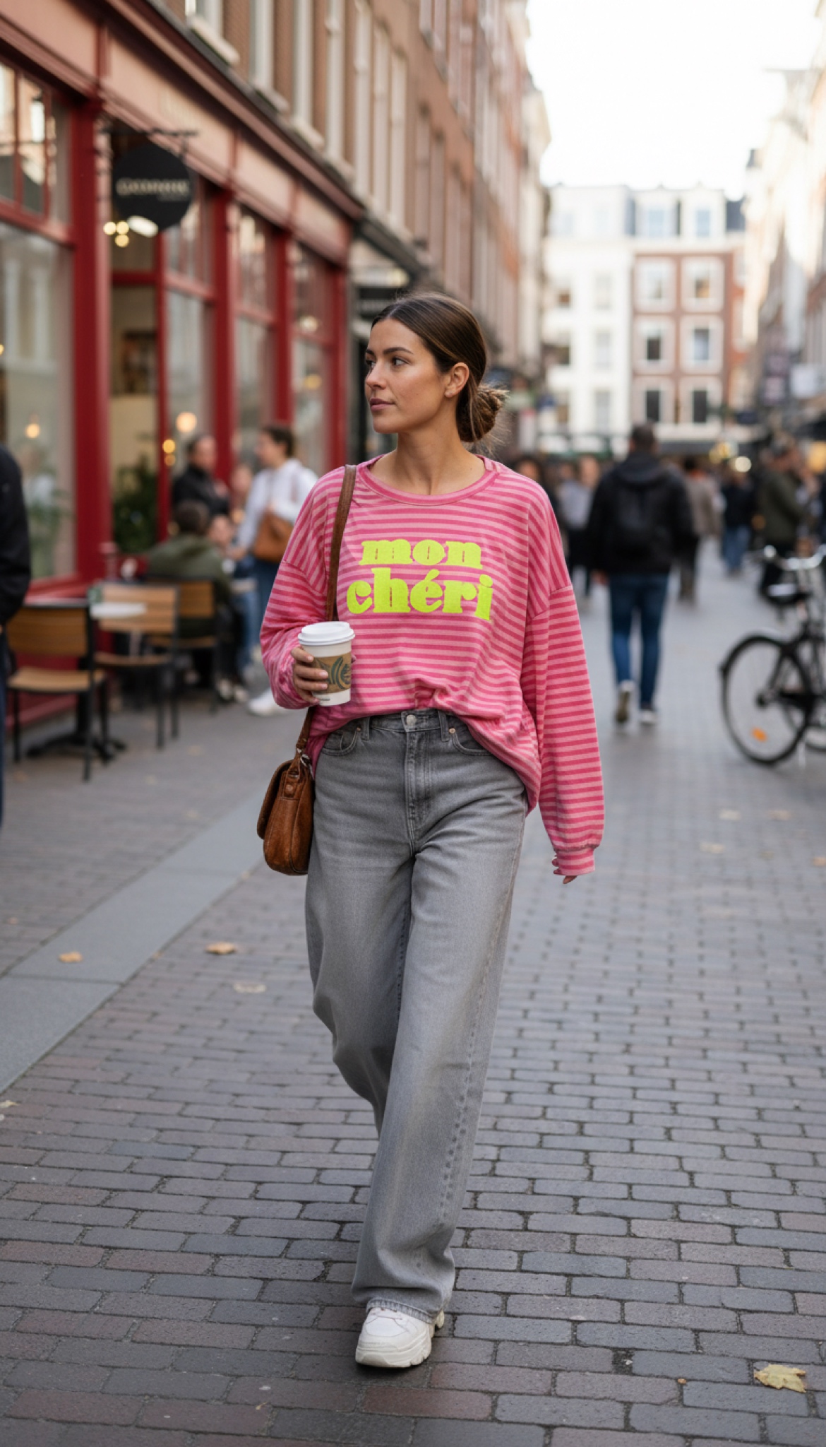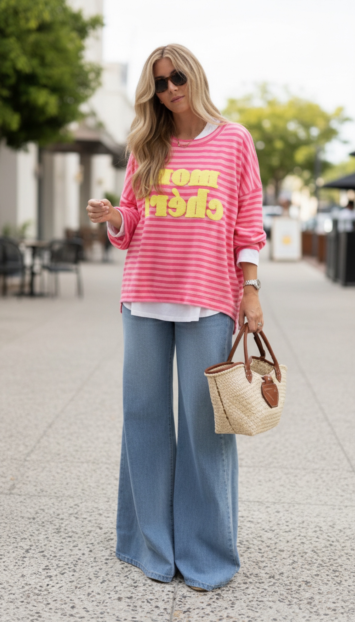 Sudadera rosa de rayas con texto amarillo flúor Mon Cheri.