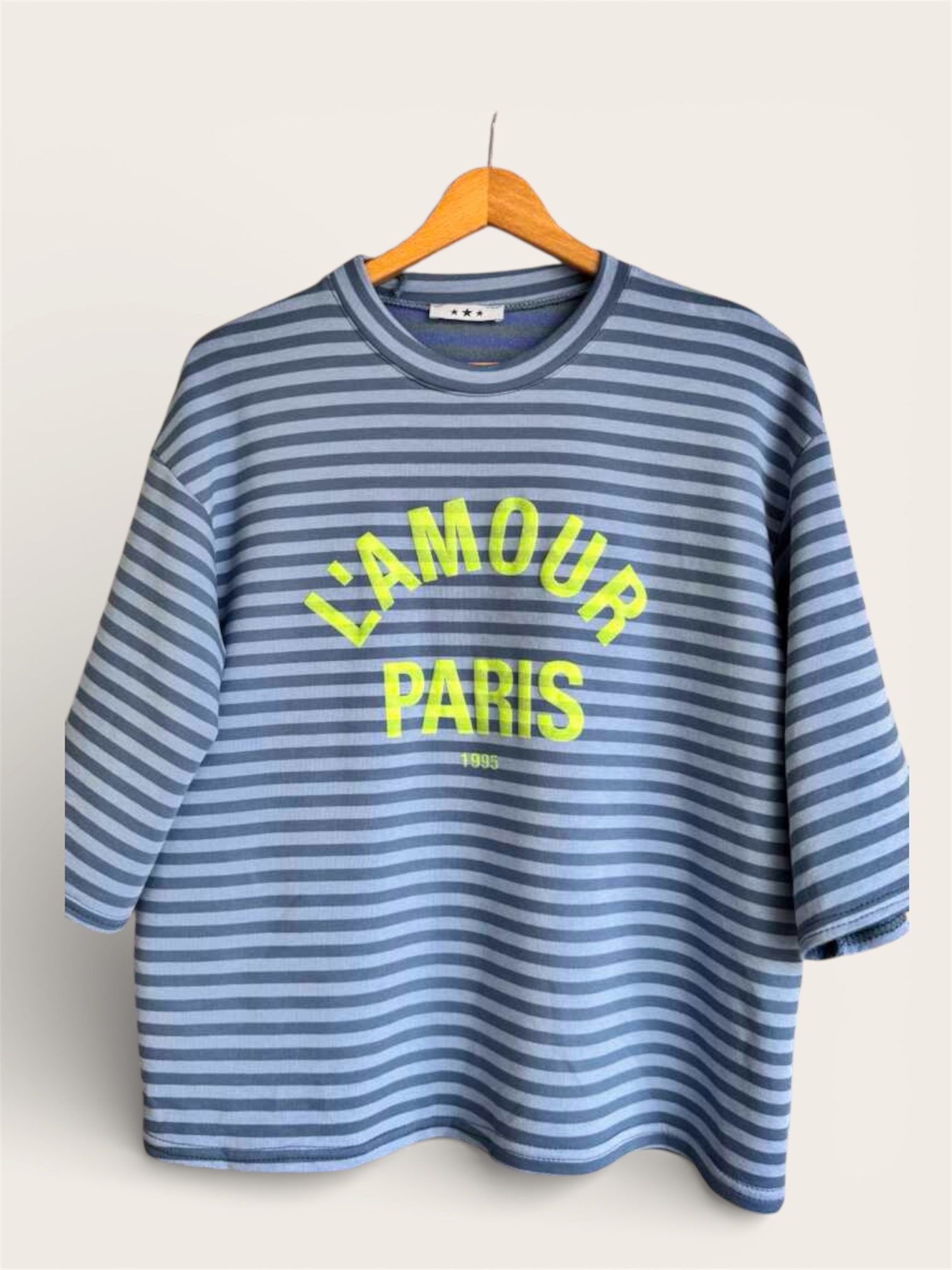 Sudadera finita a rayas con texto en la parte delantera. Media manga y cuello redondo.