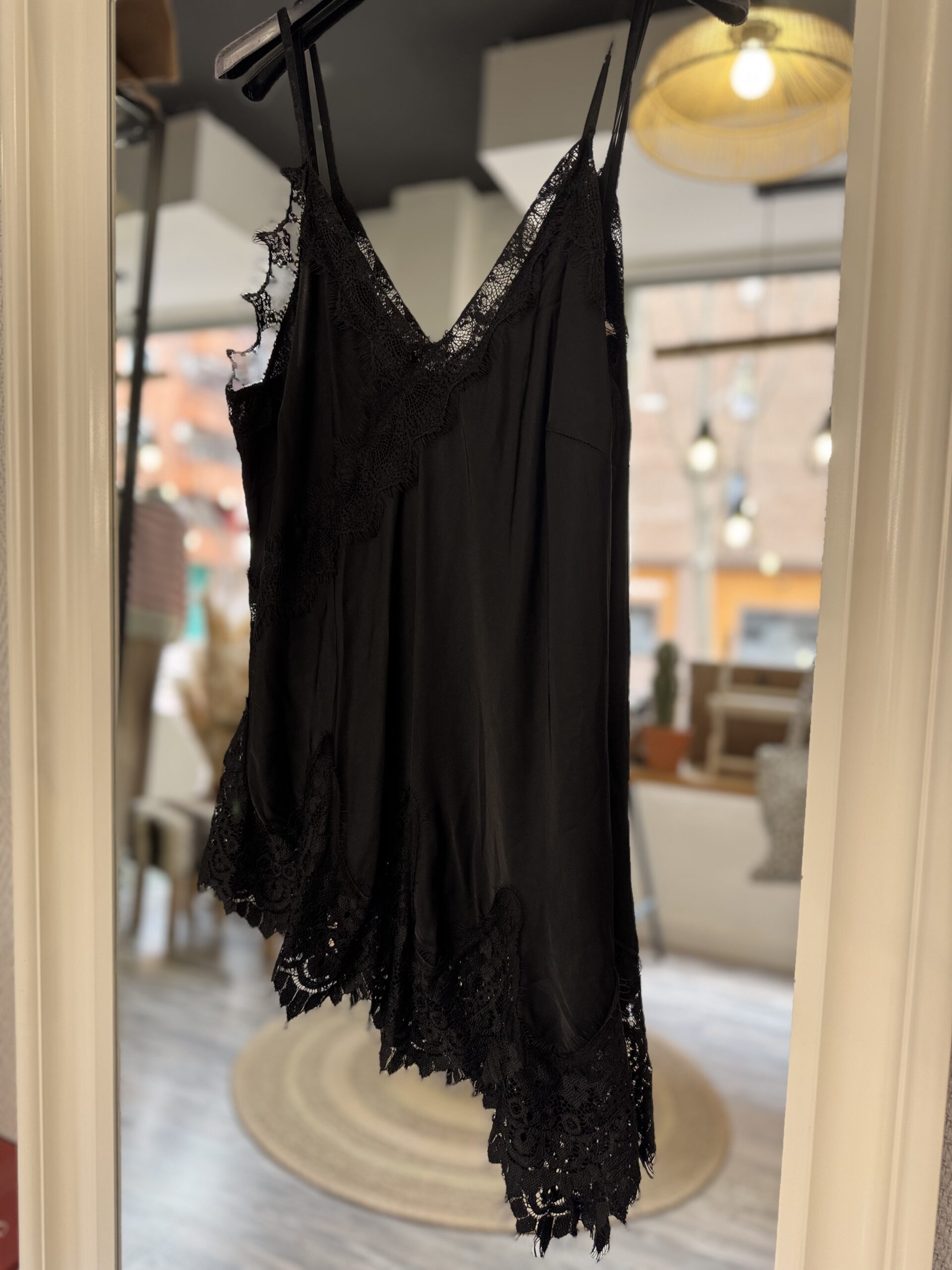 Top Lencero asimétrico en color negro con detalle de encaje.