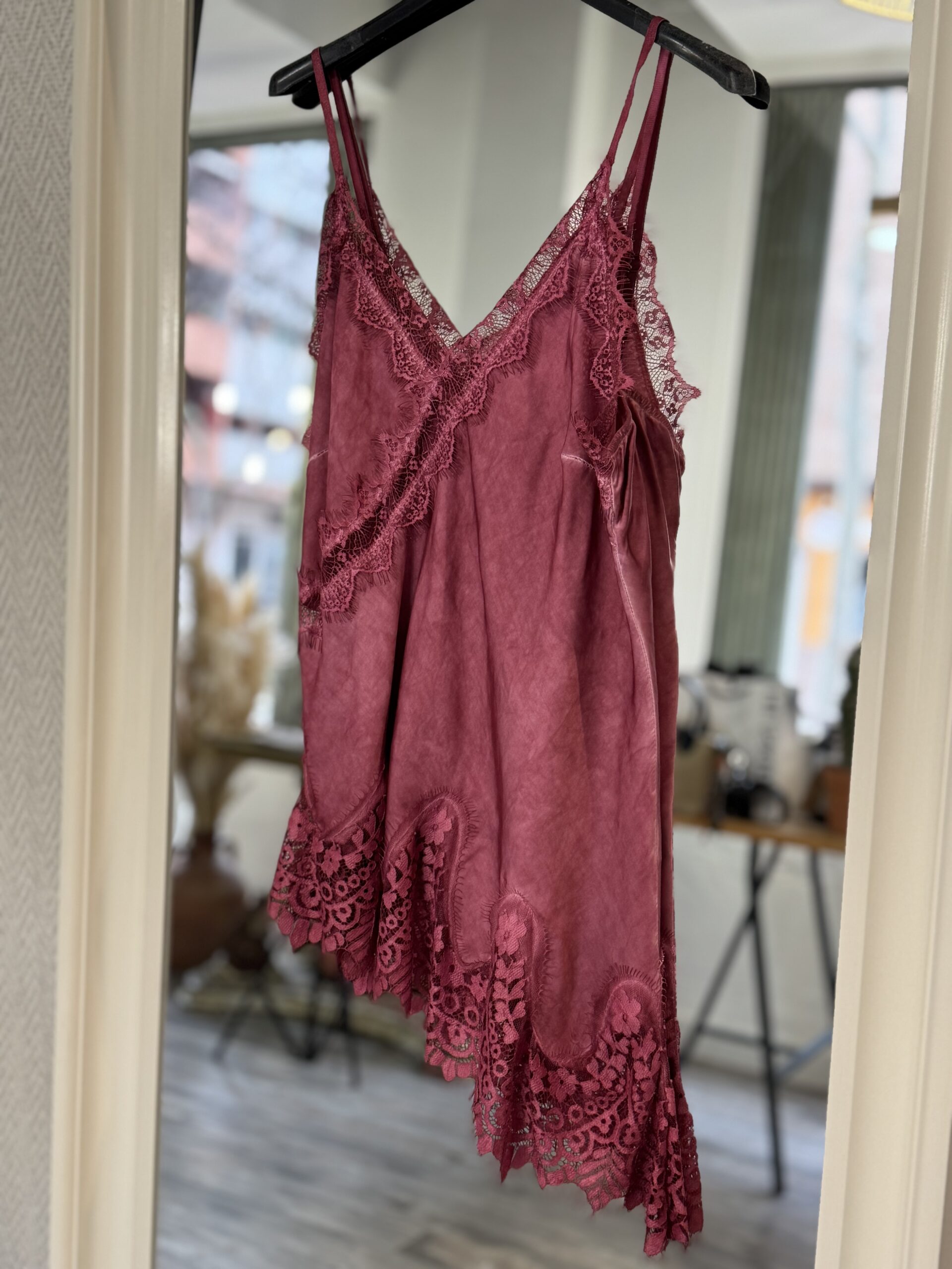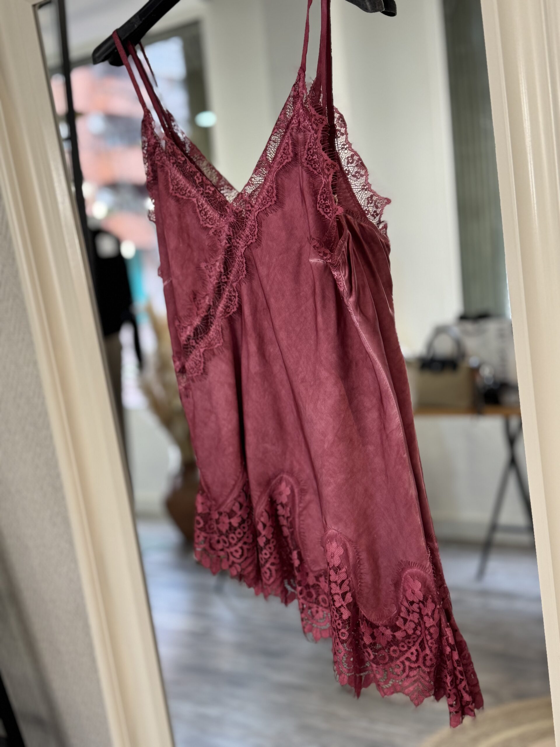 Top Lencero asimétrico en color burgundy con detalle de encaje.